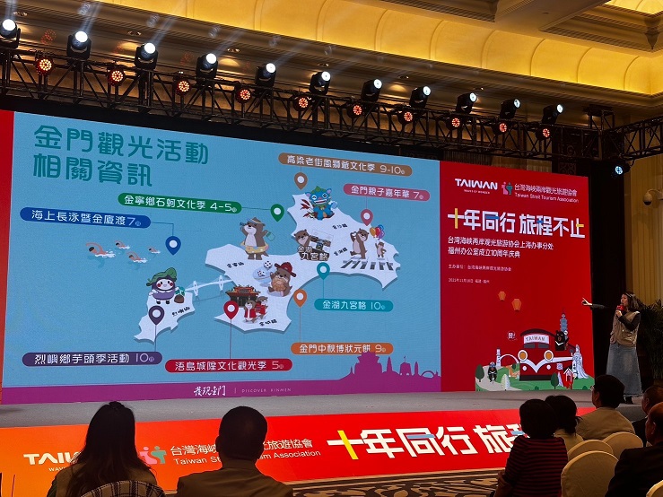 【本報大陸新聞中心 報導】台灣海峽兩岸觀光旅遊協會(簡稱台旅會)上海辦事福州分處成立十周年慶,特於今(11/18)日假福州辦理「周年慶典暨金門、馬祖旅遊推廣會」活動。縣府觀光處副處長何桂泉偕同金門旅行公會、旅館、民宿、免稅商店及旅行業者代表共襄盛舉,同時,與連江縣政府、旅行公會及福建地區各大旅行社、媒體代表齊聚一堂,共同推廣金馬離島風情。
