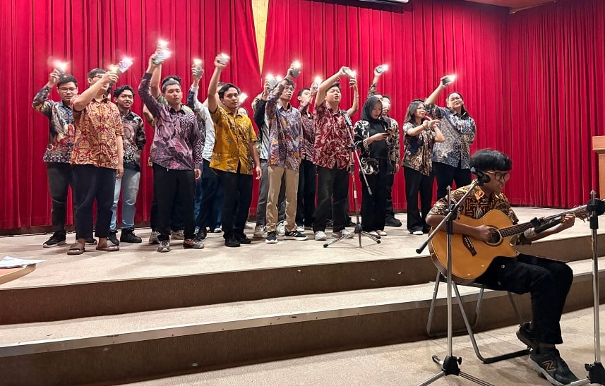 活動現場也充滿精彩亮點。來自印尼的新生馬志學帶來自彈自唱演出,儘管因吉他調整使手指略有不適,他仍以真摯歌聲征服全場,展現投入與勇氣。他分享,剛到臺灣時難免緊張,但師長與同學的熱情讓他安心許多,他會努力適應並珍惜每一天。而印尼班學生也帶來舞蹈與歌唱,展現濃厚文化風采,將活動氣氛推向最高潮。