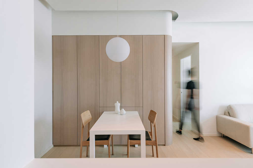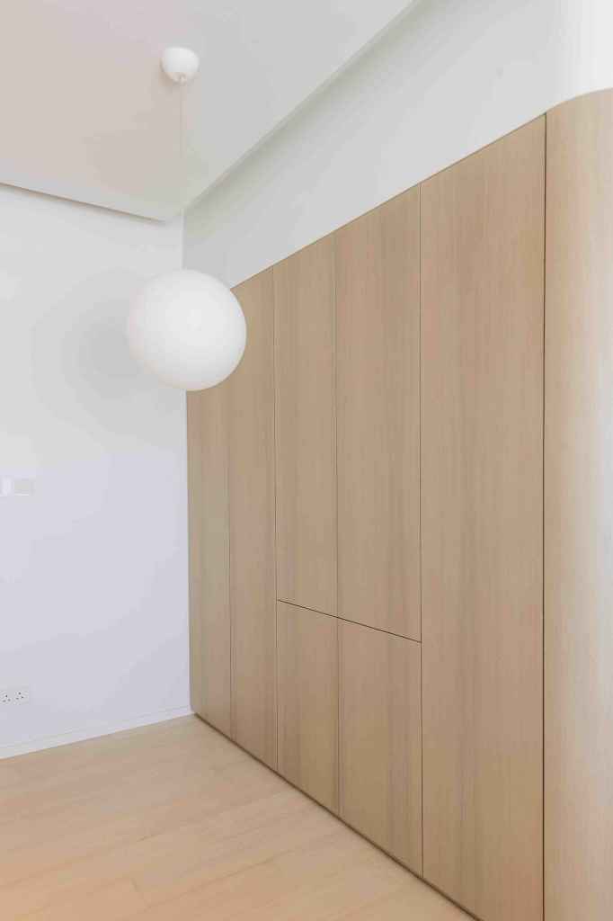 本案最核心的設計語彙,是一面柔和起伏的橡木彎牆,從廚房一路延展至臥室,彷彿輕聲細語的線索,靜靜串聯起動線、櫃體與視覺層次。這道牆不只是背景,更是匯聚生活機能的主體,其內隱藏了浴室出入口、家電設備與大量收納機能,使本來可能雜亂無章的小宅場景,呈現出井然有序的氣質。