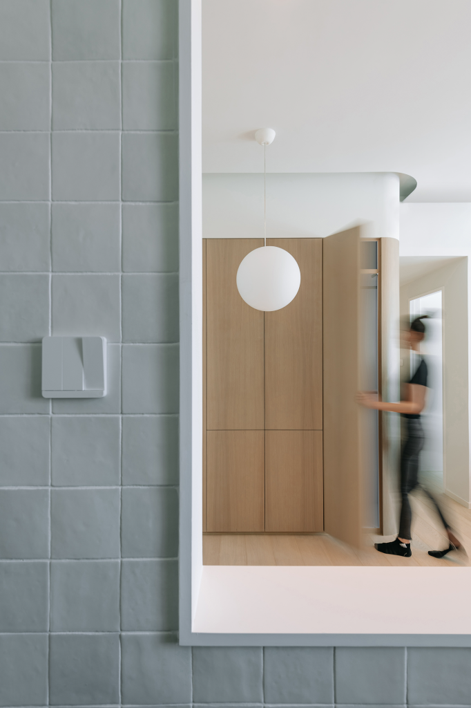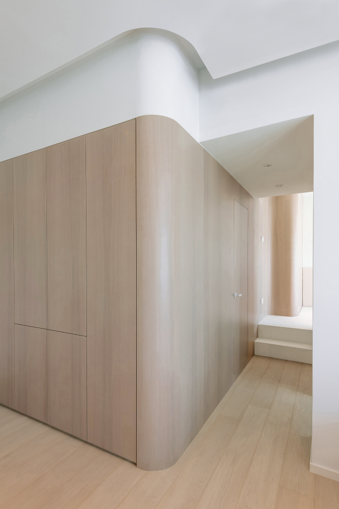 另一方面,設計師還透過結構元素柔化場域邊界。如那座橡木彎牆,以弧形曲線引導視覺重點,讓客廳到臥房的動線彷彿水波擴散,溫柔而舒緩。每個圓角的轉折,都是一次過渡與融合,從而在人與人的互動中創造出頻繁互動,即使身處不同角落,家人之間的關係仍保持緊密連結。