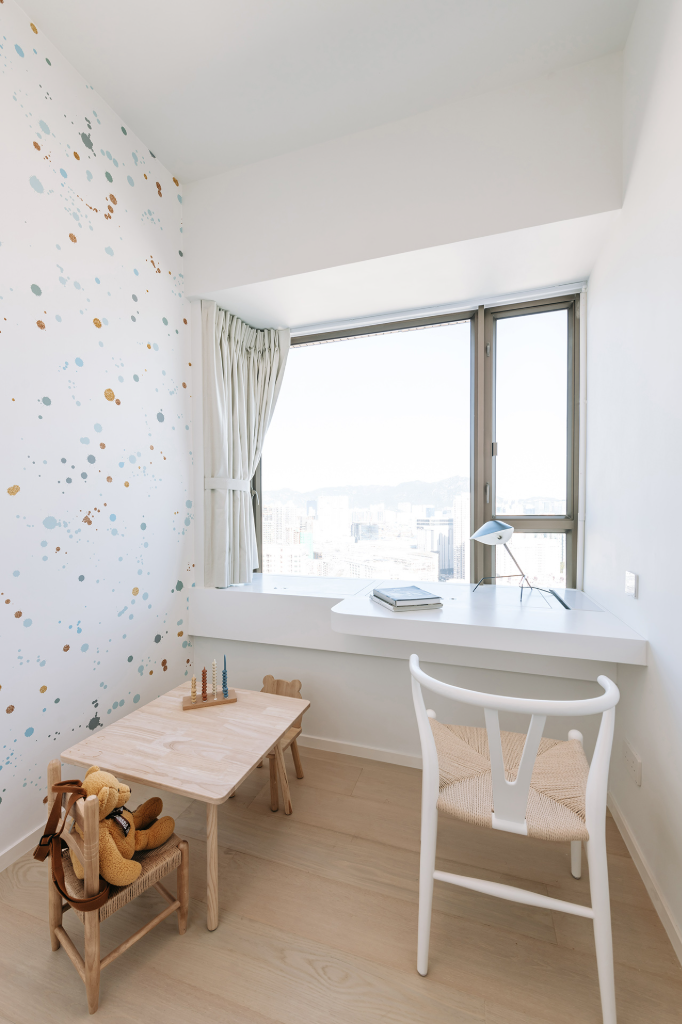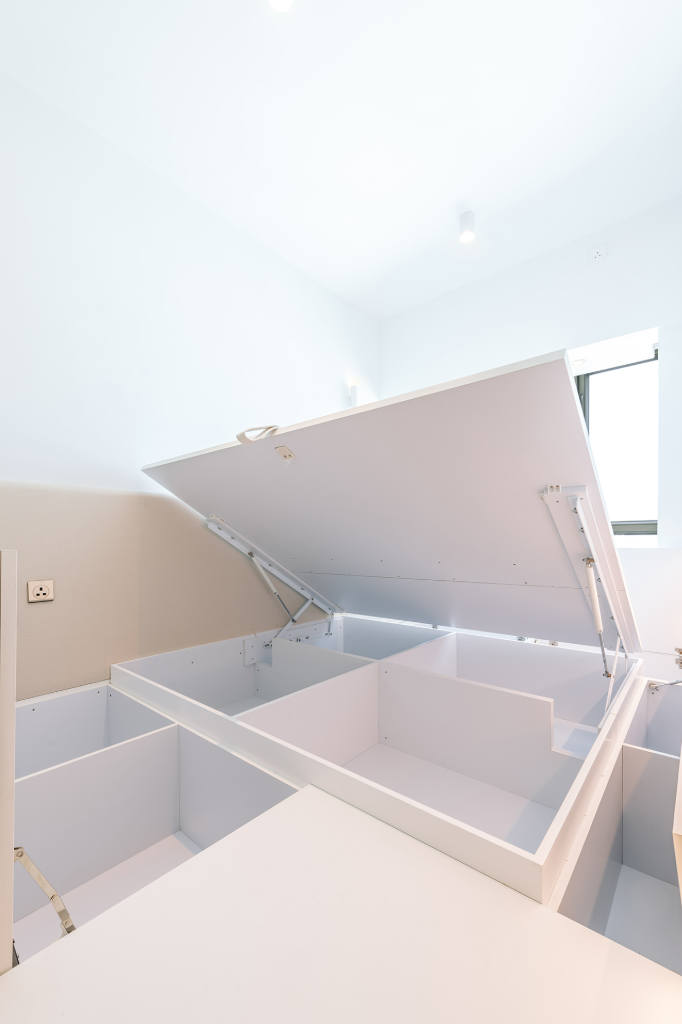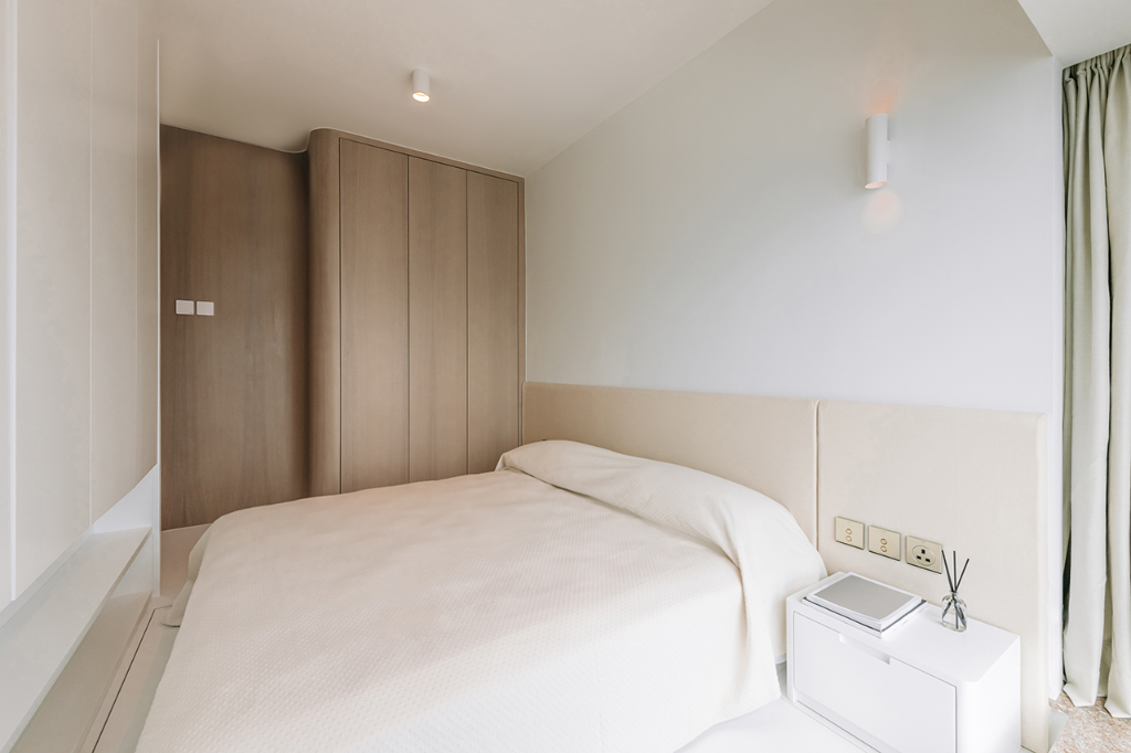 其中臥室床架內藏液壓系統,整張床面可掀起,底下空間可整齊收納換季衣物與貴重物品;孩童房則使用柔和紋理搭配簡約設計,提供安全溫馨的成長環境;而窗邊臥榻、客廳座椅與書桌也皆暗藏翻掀機關,不著痕跡地強化日常儲物彈性。