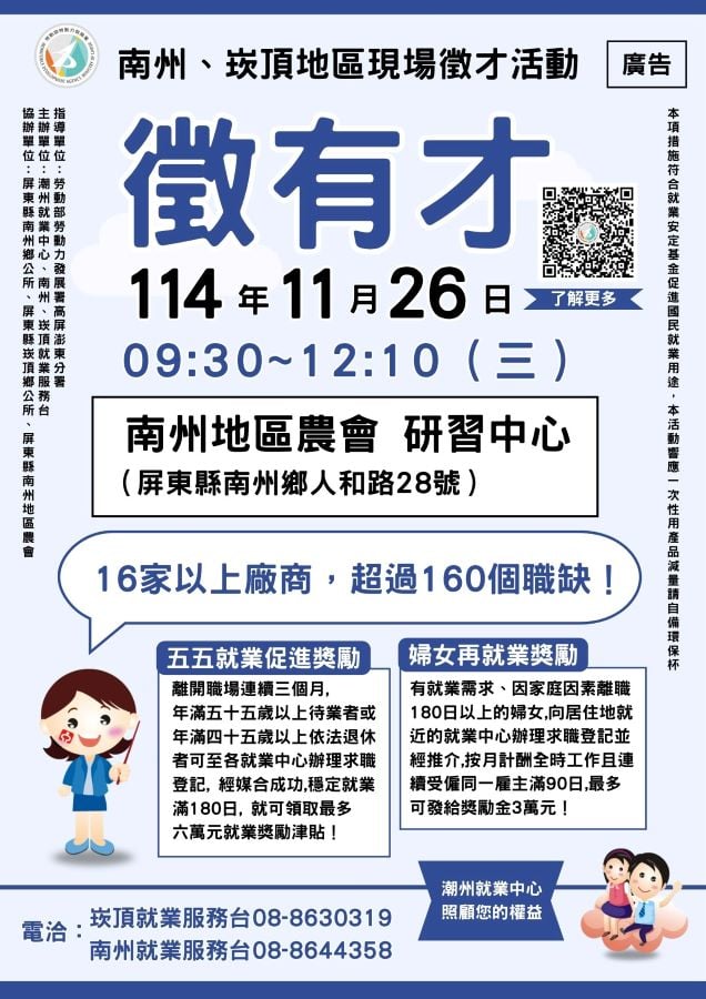 ▲潮州就業中心11/26上午在南州地區農會研習中心辦屏南地區今年度最後一場聯合徵才活動,要找工作的朋友請把握機會。
