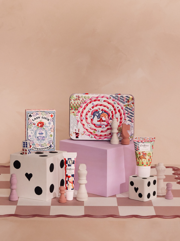 以俏皮又懷舊的節慶氛圍為主題,採用手繪風格的桌遊路徑印花,描繪經典的