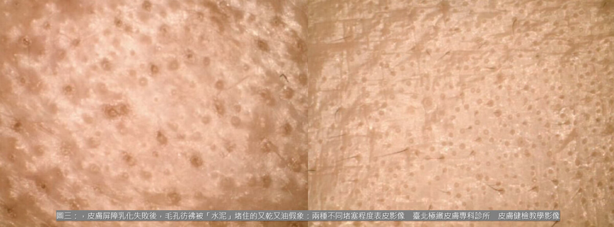 真實情況是:熱水讓角質栓吸水膨脹後再迅速脫脂,結果使得角質栓更乾硬、更緊實,也更難乳化排出。顯微影像可以看到這些毛孔彷彿被「水泥」堵住:裡面是堅硬的黑色核心,外層又被乾硬角質壓住,粉刺自然不易代謝。少量溢出的皮脂因乳化失敗,只能浮在表皮,使人誤以為「又乾又油」。