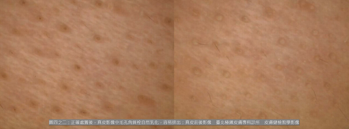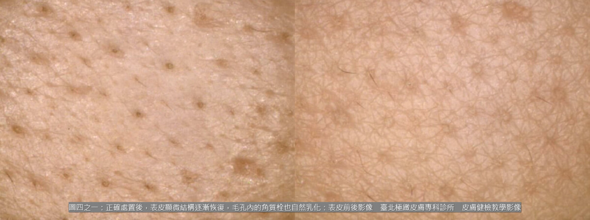 更關鍵的是,正確且適度的清潔使皮脂得以保留,角質層板的黏著得以維持,皮膚屏障就有機會啟動自然修復。醫師表示,在長期皮膚鏡追蹤中可看到,隨著皮脂膜恢復,表皮顯微結構逐漸變得飽滿而完整,毛孔內的角質栓也因自然乳化而更容易排出。這正是許多患者改用清水洗臉後,粉刺反而「輕輕一按就掉落」的原因。