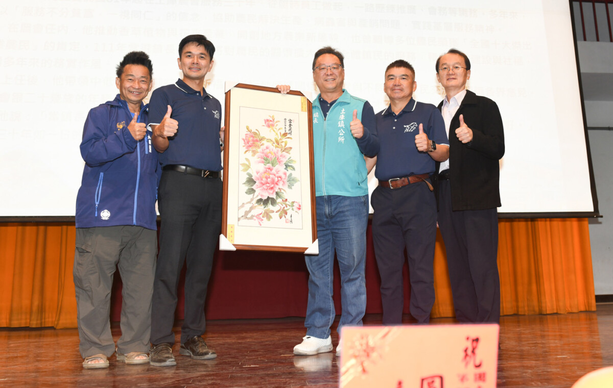 ▲吳星宏校長(左2)致贈薪傳獎王宏隆大師(左1)畫作給土商典範人物黃伯文主委(中),與土庫商工家長會長吳俊儀(右2)、雲林國中校友會理事長吳宏星(右1)合影。(記者劉春生攝)