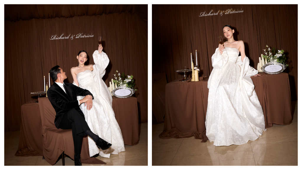 晚宴部分,林映唯以兩套由The Wedding Gown代理的以色列婚紗品牌禮服展現截然不同的造型氛圍,正宴禮服以Heli Kalkstein的蕾絲透紗禮服性感亮相,細緻蕾絲與若隱若現的透紗勾勒迷人輪廓,帶有法式般的自然性感,搭配CHANEL高級珠寶COCO CRUSH 耳環及戒指,標誌性菱格紋線條與透紗質感相互呼應,將優雅與性感平衡得恰到好處;Richard則以CHANEL高級珠寶COCO CRUSH戒指與單邊窄版圈式耳環延續俐落風格,低調卻不失細節。林映唯送客則換上Alon Livné的立體剪裁兩件式宮廷感禮服,立體壓紋與戲劇性剪裁,加上兩件式設計讓造型更具層次,也為宴會帶來強烈的時尚存在感,並選擇 CHANEL高級珠寶ETERNAL N°5鑽石項鍊與戒指作為焦點。