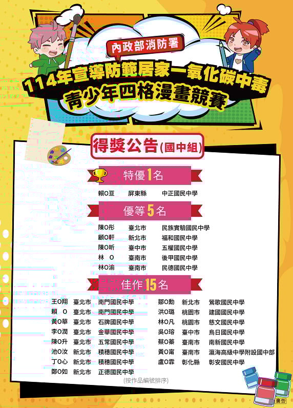【記者 高鐿玲/台北 報導】為了提醒大家預防一氧化碳中毒的重要性,消防署舉辦「114年宣導防範居家一氧化碳中毒青少年四格漫畫競賽」,競賽分為國中組及高中組,各組都選出特優1名、優等5名及佳作15名,計有42名獲獎者。