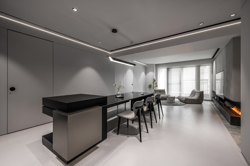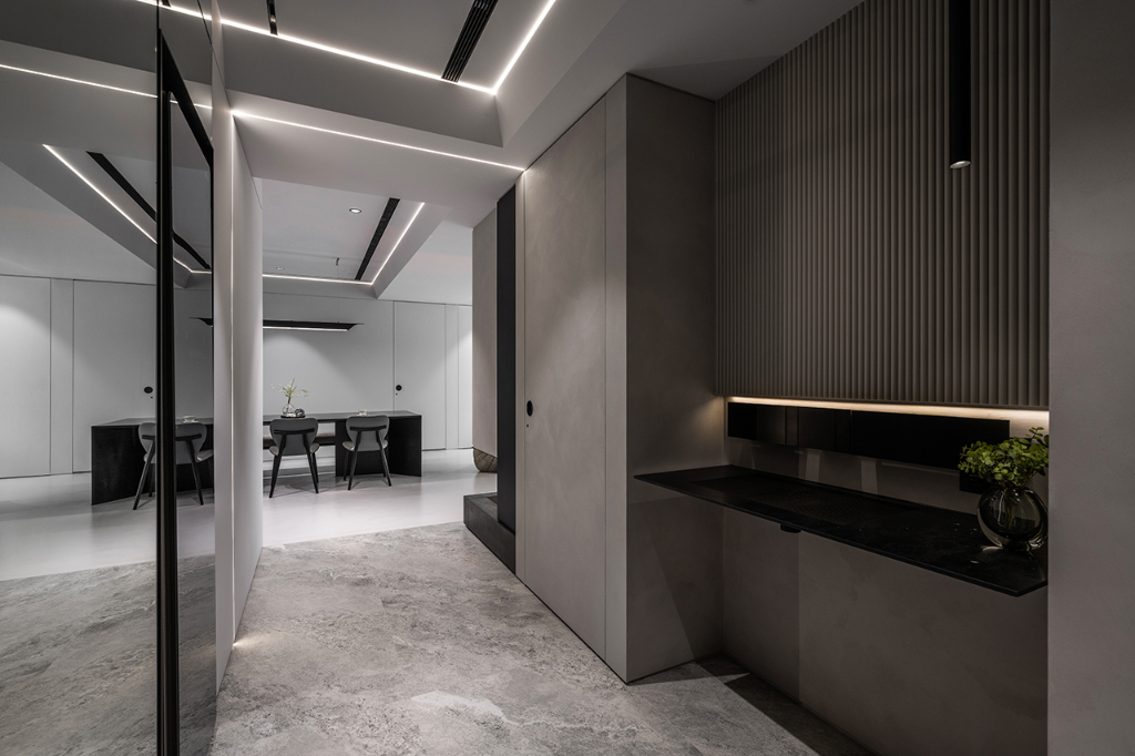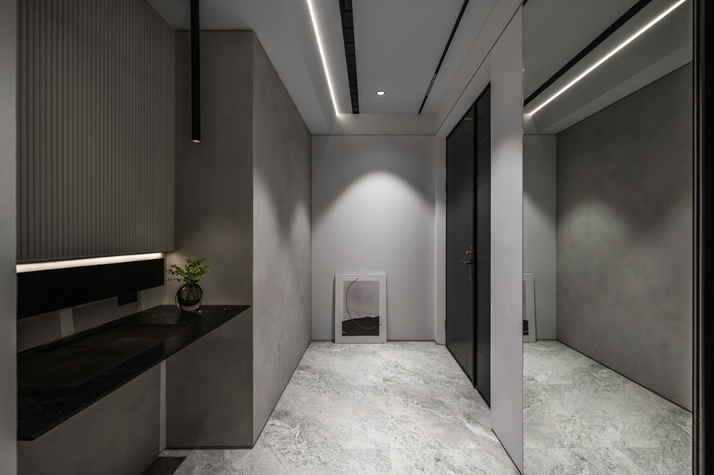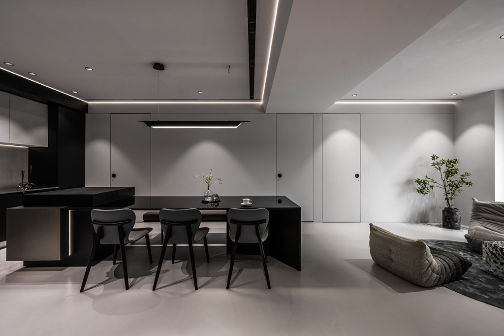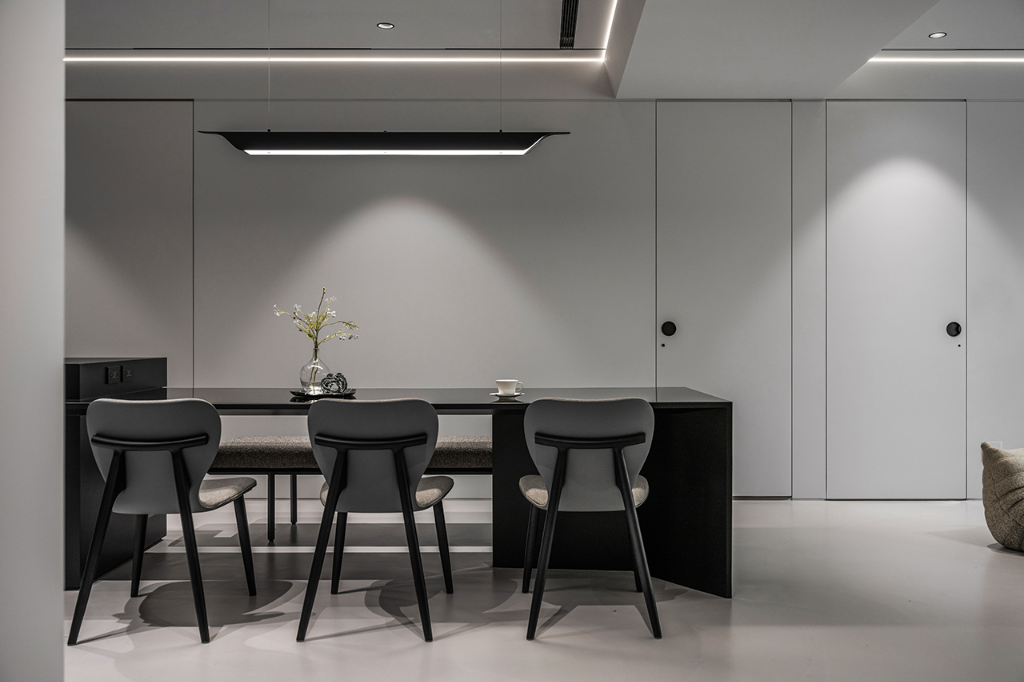 本案在設計初期,屋主與設計師之間對於「俐落不簡陋」這個主軸,曾有過想像上的落差。為了實現這份抽象美學,設計團隊回歸最原始的黑、白、灰基調,以此淬煉出極簡風格。透過空間結構的合理性與動線的流暢律動,致力建構自然舒適的流動感,再藉由簡約環境與俐落線條,反映出觀者的內在心境與思緒感受。