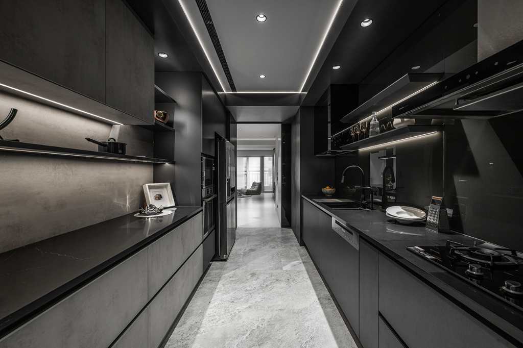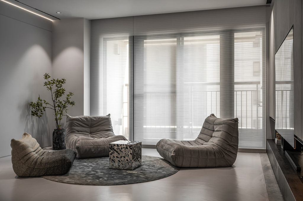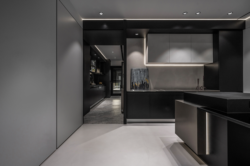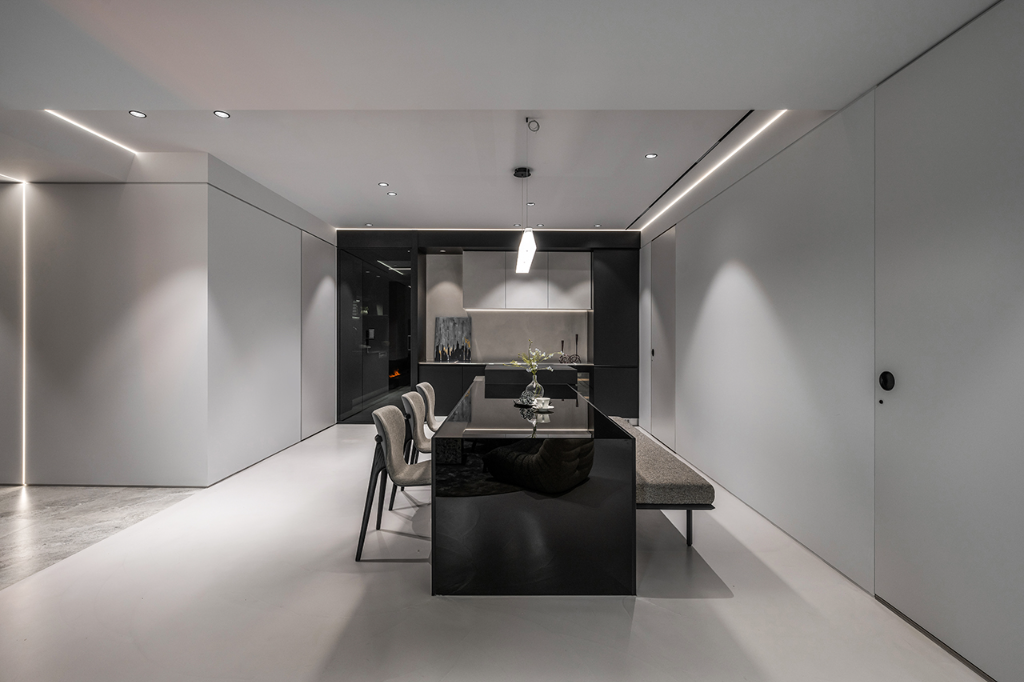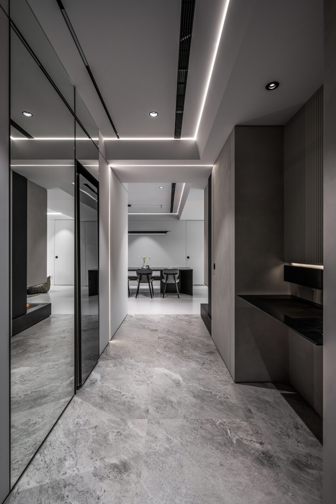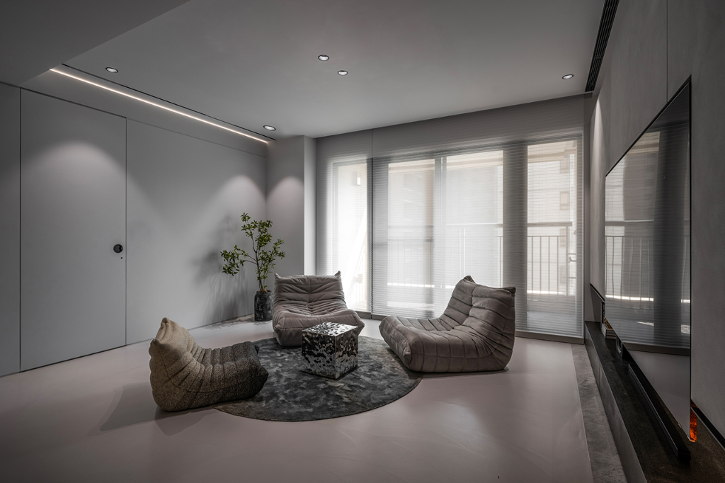 本案在設計初期,屋主與設計師之間對於「俐落不簡陋」這個主軸,曾有過想像上的落差。為了實現這份抽象美學,設計團隊回歸最原始的黑、白、灰基調,以此淬煉出極簡風格。透過空間結構的合理性與動線的流暢律動,致力建構自然舒適的流動感,再藉由簡約環境與俐落線條,反映出觀者的內在心境與思緒感受。