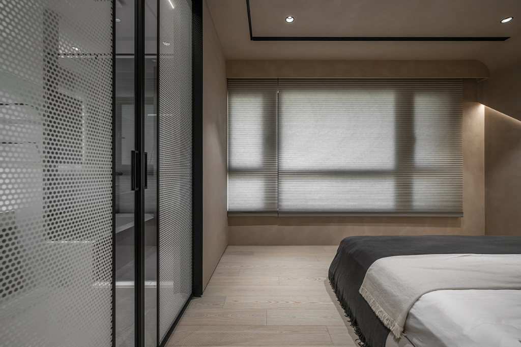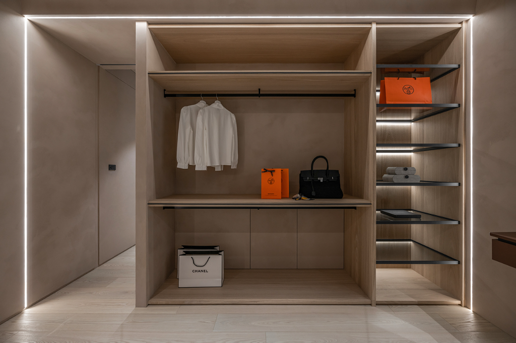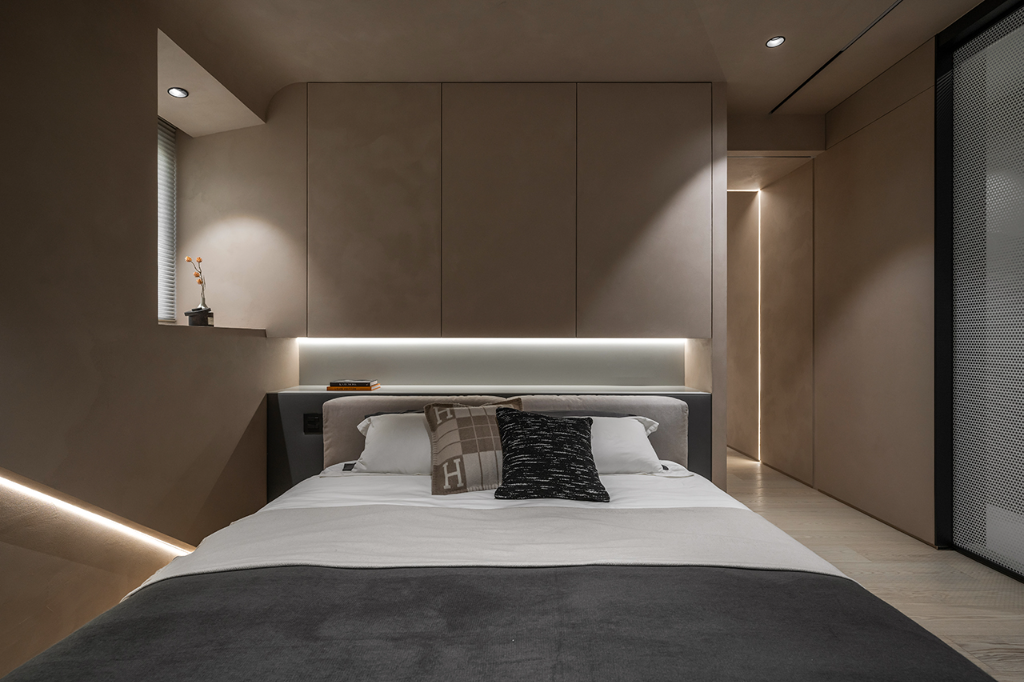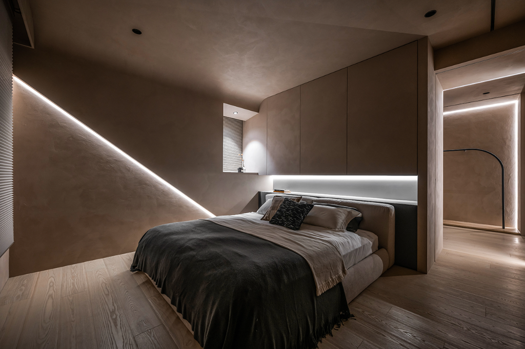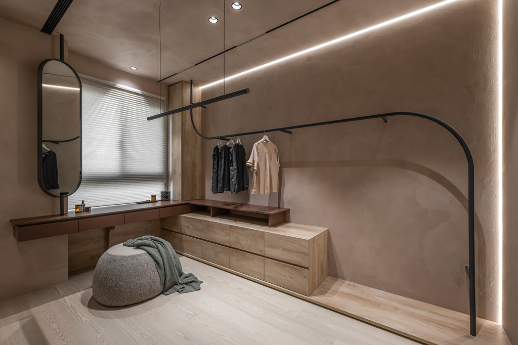 最後來到主臥室,首先會經過獨立更衣室,此處使用溫暖的大地色系進口礦物塗料,搭配實木地板,營造出溫暖的異國度假風情,還以大量造型鐵件提供衣物吊掛,在不造成衣櫃量體厚重感的同時,也兼顧衣物的收納量。主臥寢室區同樣以大地暖色礦物塗料為主基調,並利用原本的建築結構,延伸出一道45度的燈光牆面,並透過框景手法保留一扇景觀採光窗台,為此處增添獨特的氣質與靜謐氛圍。且房內兩面落地窗在納入開闊的國家歌劇院景象之餘,也最大程度強化儲物效能,一舉滿足屋主多年來收藏經典漫畫的收納及陳列需求。