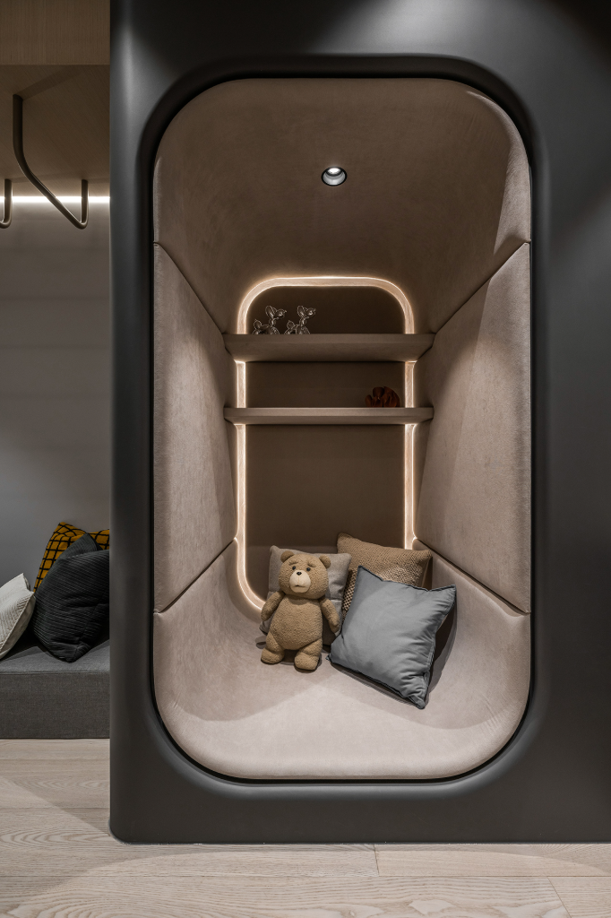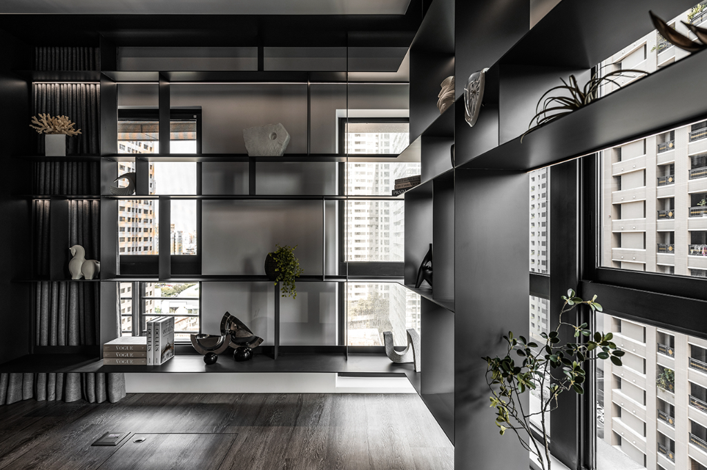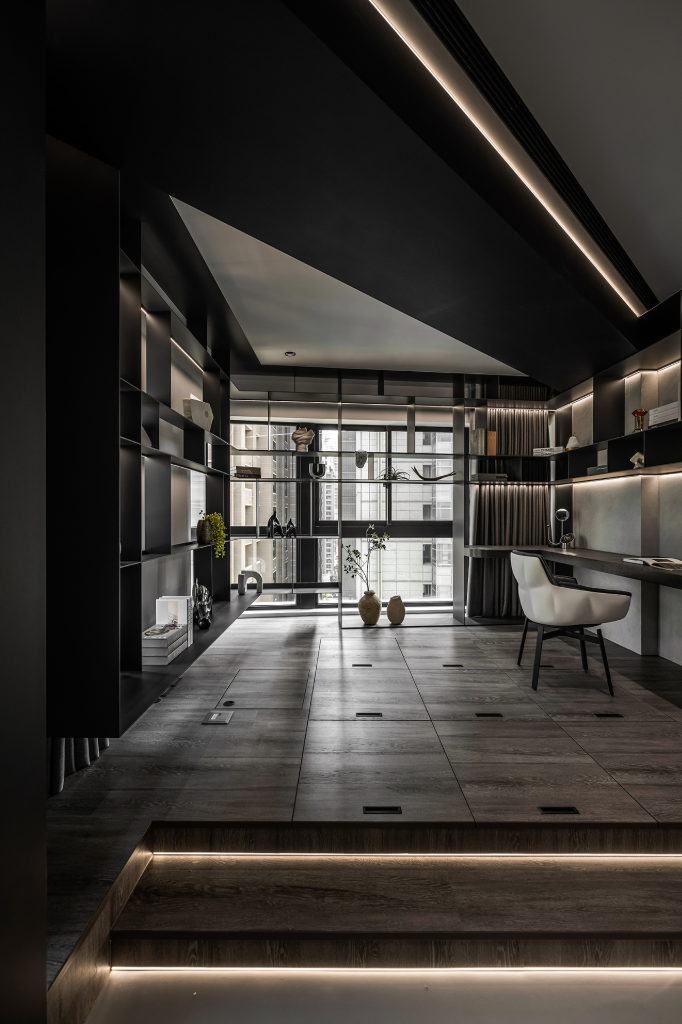 進入私領域,設計師則綴入溫潤的木紋,以細膩紋理拉開景深,展現隨興自在的居家樣貌。私領域的配置包含小孩房、主臥室以及一間多功能視聽室兼客書房,三個區域彼此互不連貫,各自擁有明確的個性與使用定位。多功能視聽室不僅能作為書房,因其獨立的浴室與完善的進口衛浴設備,同時也能擔任客房角色,供來賓暫歇休憩,設計師更透過抬高地面與鋪設木地坪的方式,將其與公領域的盤多磨地坪區隔開來,並為升降視聽設備及收納創造足夠的空間。