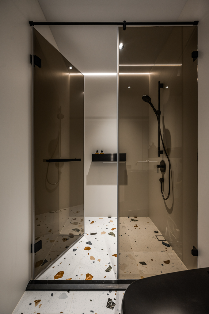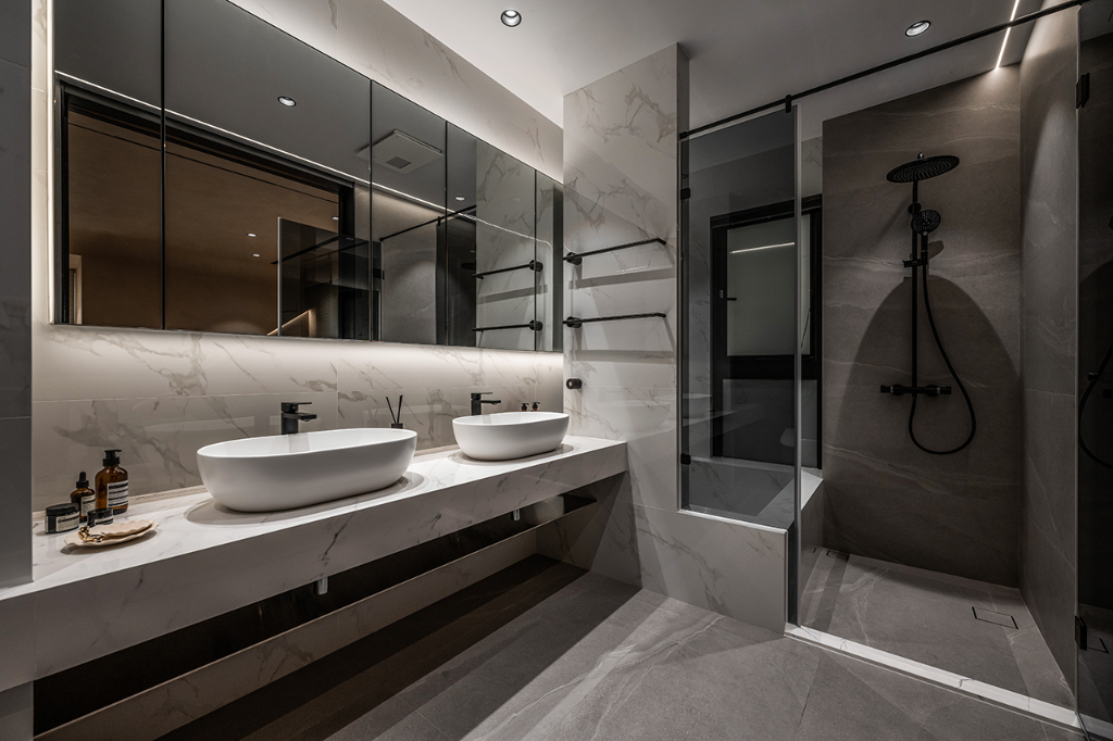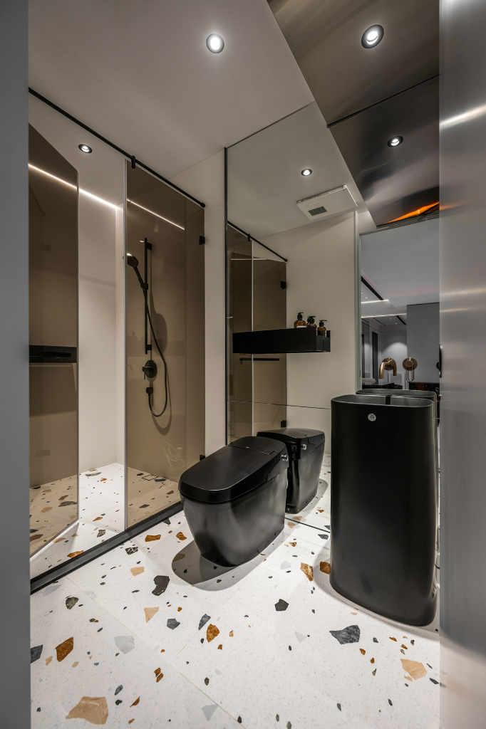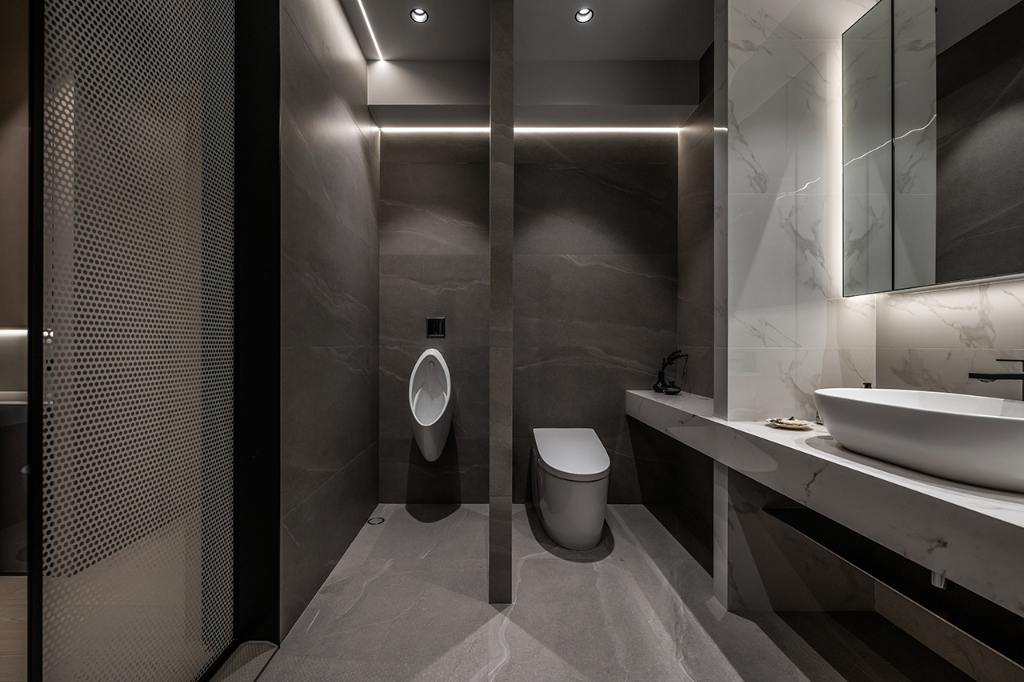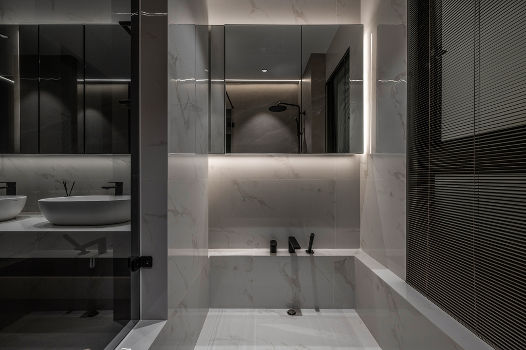 建材方面,全室皆採用符合國家級標準的合格綠建材,壁面選擇親膚無毒的天然塗裝建材,確保甲醛係數符合安全範圍。此外,本案也融入後疫情時代的考量,採用全智能家居並安裝可調控強弱的節能燈光,藉由科技系統的輔助,減少了手掌與壁面接觸的機會,降低家庭成員交叉感染的可能性。而玄關特別設計的洗手區,讓屋主一進門就能清潔雙手,加上基地兩面採光的大片落地窗,不僅能援引自然日光,常保環境乾燥舒適,更可避免黴菌滋生,為一家人提供安心的生活品質。