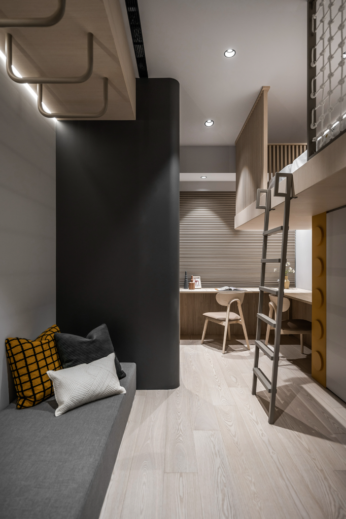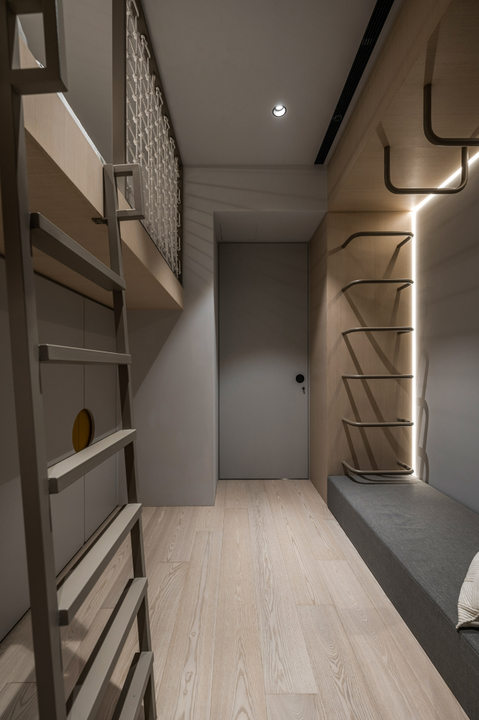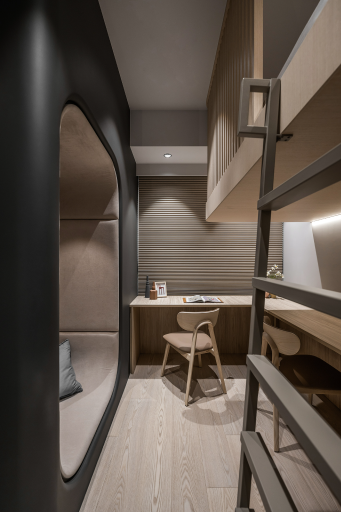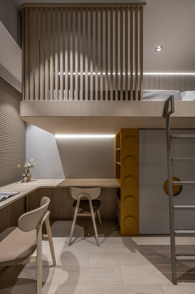 小孩房則沿著面窗牆面設置連續的桌面與收納,連結著另一側的上下床組收納系統,組合成一個有著樂高表面造型的連續書桌床組與衣物收納量體 。這樣的設計不僅充滿童趣,也進一步提升空間的使用效率。