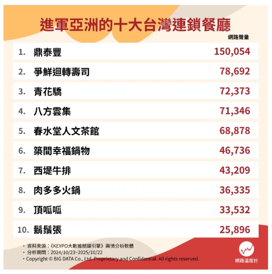 許多連鎖品牌不只征服在地饕客,更靠著創新與堅持,把一碗熱湯、一口香氣,變成台灣最動人的文化輸出。《網路溫度計DailyView》透過輿情分析軟體《KEYPO大數據關鍵引擎》,排除手搖飲與小吃攤,精選出進軍亞洲的十大台灣連鎖餐廳品牌。