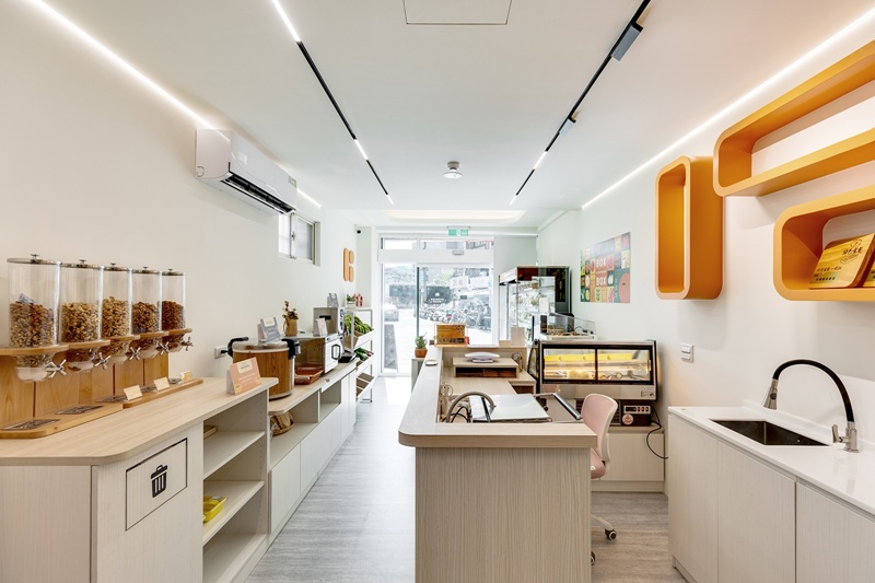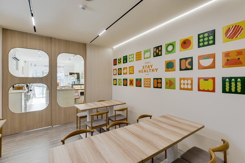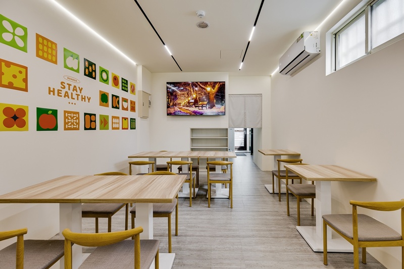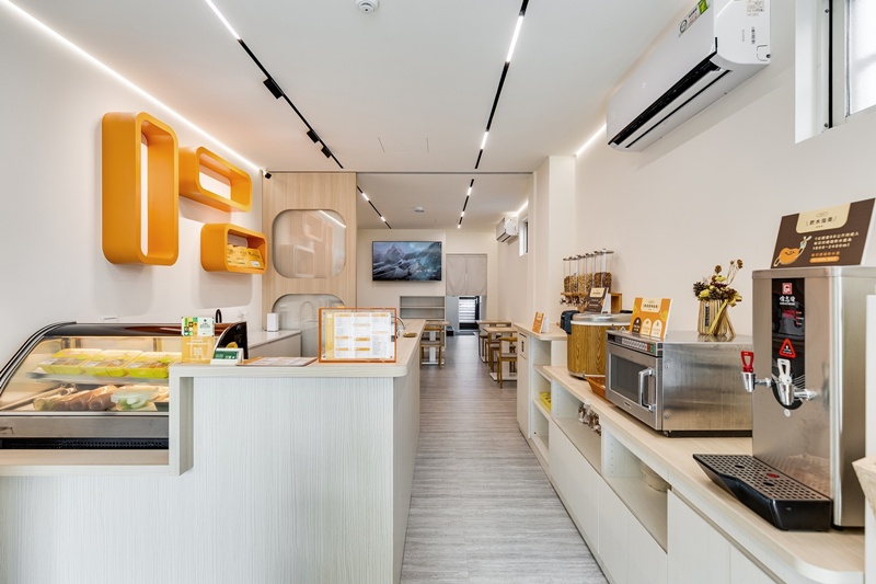 本案延續品牌對健康與永續的承諾,選用天然木質桌椅與綠建材系統板材,搭配低污染環保塗料,讓「吃得安心」延伸為「空間也安心」。設計透過盒型語彙傳達「精準份量、減少浪費」的理念,引導顧客實踐支持永續飲食的日常選擇。大面採光與線性燈配置兼顧節能與氛圍,明亮色彩與木質調性平衡都市日常的冷感,打造出健康、安心、充滿活力的商店空間。