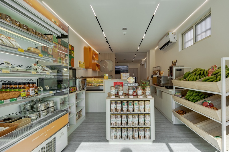 整體空間依動線分為展售外帶區與內用餐敘區。前段配置冷藏層架、蔬果展台與結帳櫃檯,以白牆搭配淺色木質櫃體,營造潔淨印象;展示台與設備櫃體多採圓角設計,提升安全的同時也呼應品牌標誌的圓角造型。牆面配置鮮橘色的品牌盒形展示架,形成視覺焦點。後方內用區則以自然木質桌椅結合牆面蔬果圖像,造型活潑、色彩飽和,搭配盒型崁玻璃拉門與線性燈帶,放大狹長格局,營造輕鬆而舒適的用餐體驗。