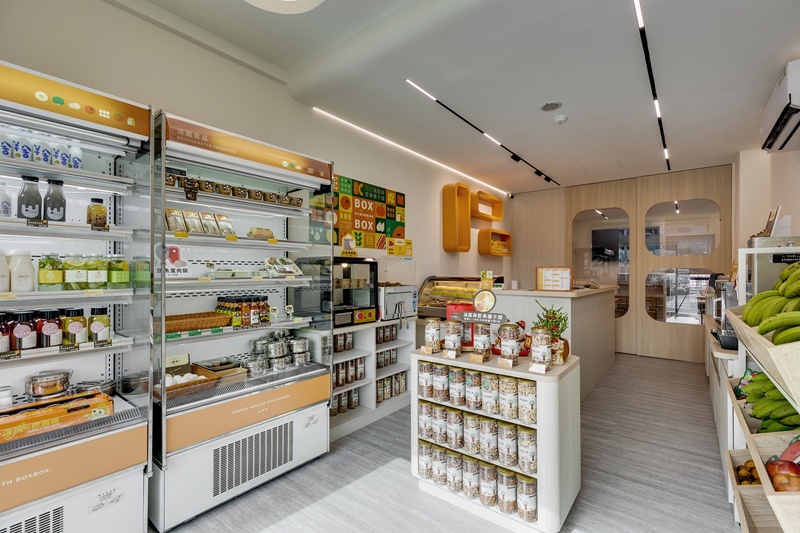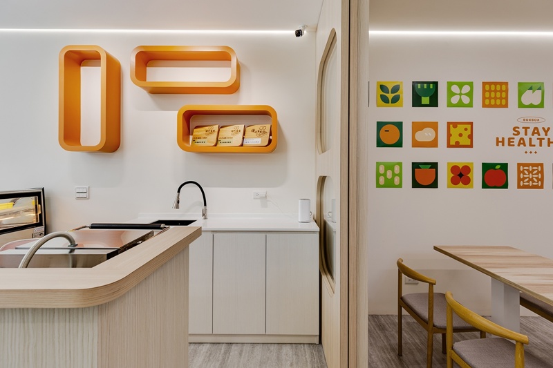 本案為健康餐食品牌「盒盒」的門市空間設計,透過幾何造型與明亮配色,將品牌理念具象於場域之中。以餐盒為靈感的造型語彙貫穿整體,展示架、燈具與隔屏層層嵌構,整體空間彷彿一個放大化的「盒盒」。橘色標誌、木紋櫃體與蔬果色彩牆的應用,為空間注入輕快節奏與親和語調,延續品牌明亮健康的視覺基調。設計將品牌餐盒意象轉化為空間語彙,將其象徵的精準飲食與環境友善的思維,實現在場域細節之中。