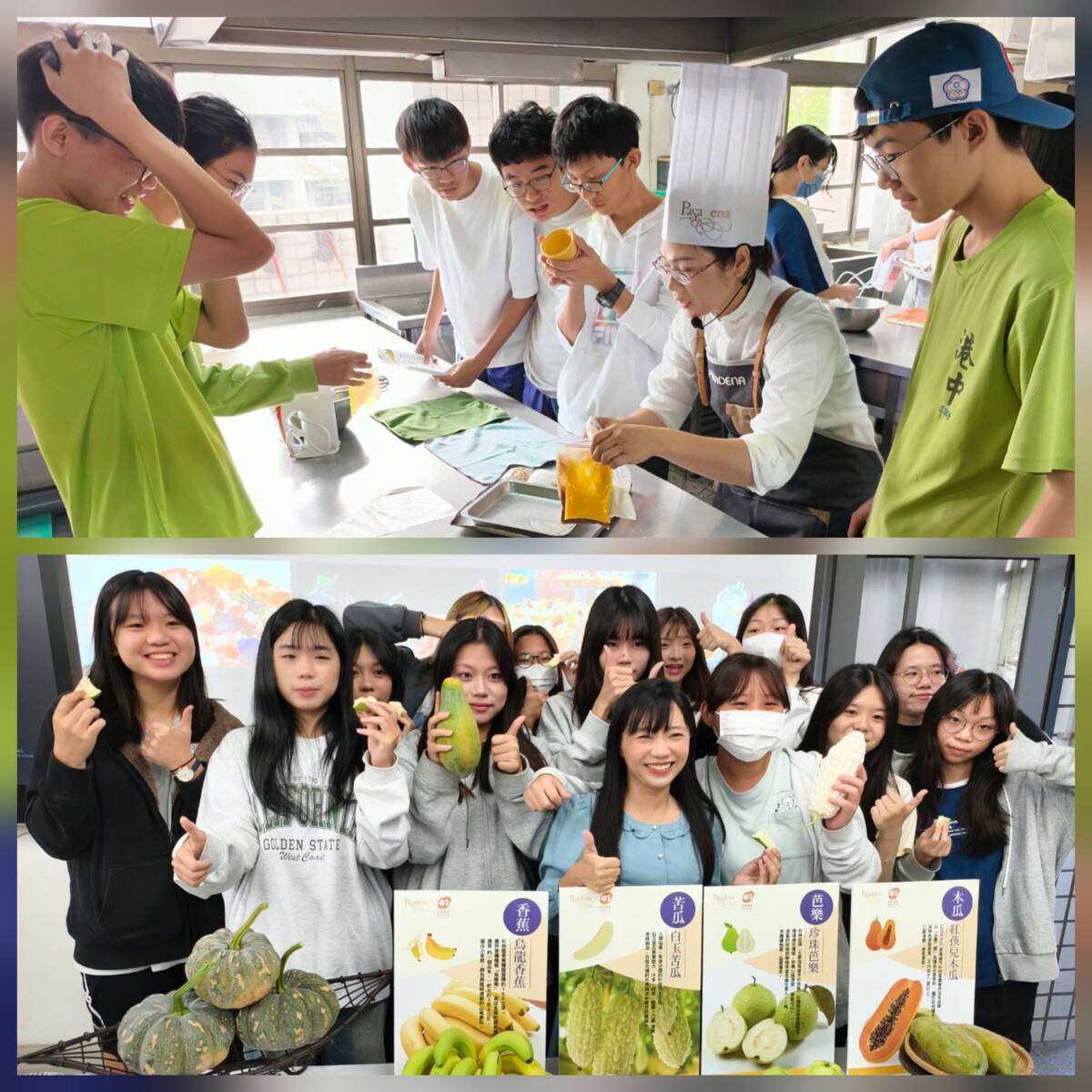 杉林社區發展協會理事長陳國忠帶領2位杉林在地小農葉智宏與陳振雄來到現場,帶來清晨現摘的新鮮蔬果,示範「蔬果色彩學」並展示杉林社區四大代表農產:紅孩兒木瓜(紅)、白玉苦瓜(白)、烏龍香蕉(黃)、珍珠芭樂(綠),透過觸摸、觀察與味覺體驗,引導學生理解食材從產地到餐桌的旅程,認識農村的努力與土地的價值,活動現場亦安排帕莎蒂娜營運經理Vincent教授「西餐禮儀」,以餐桌美學為切入,讓學生學習國際基本禮儀,也看見飲食所承載的文化與生活品味。高雄市立小港高中校長薛鈺勤表示,非常感謝農業局、杉林社區及帕莎蒂娜舉辦這次的味覺教育,讓學生們可以學習西餐知識及認識在地蔬果,並在合作製作香蕉舒芙蕾的過程中,體會男女平等精神,同時學習尊重、分工與團隊合作,對學生們來說是非常有意義的一堂課。
