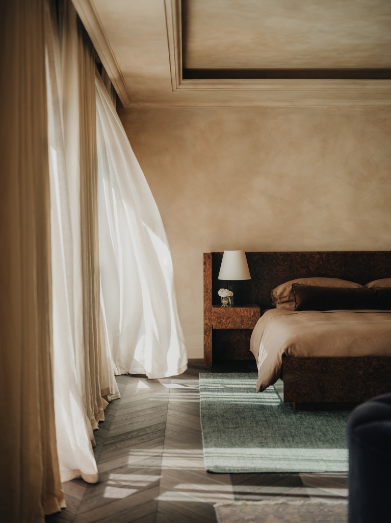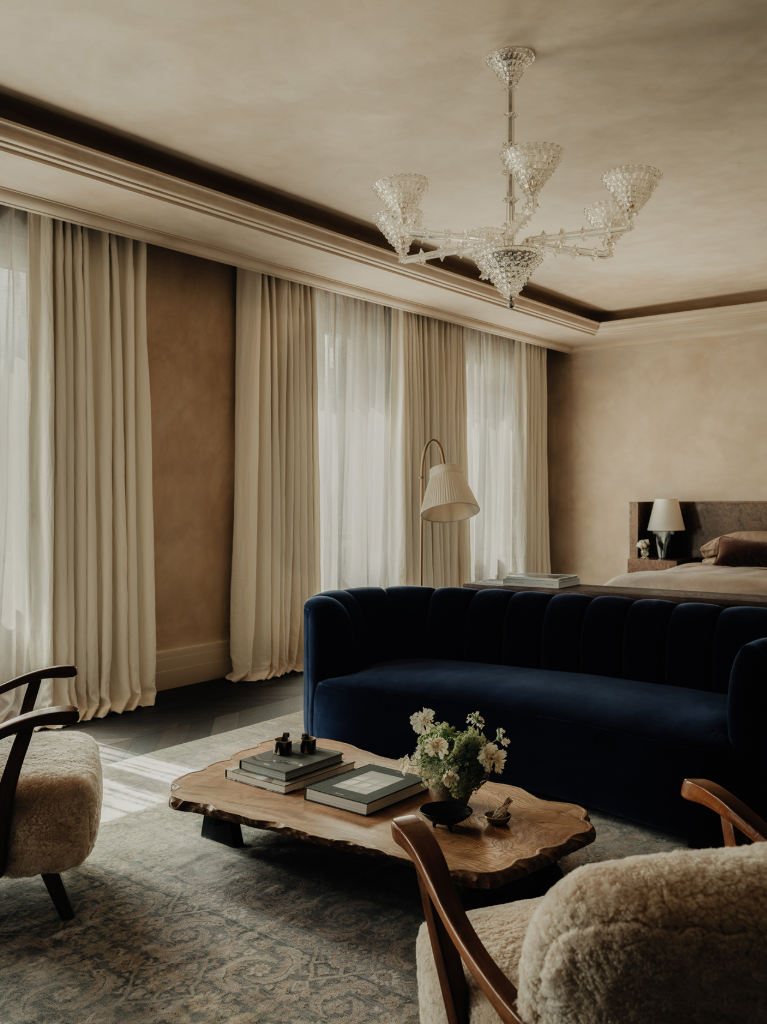 主臥室位於二樓,設計團隊以極簡手法打造舒適寧靜的居所。訂製瘤花胡桃木床架環繞睡眠區,丹麥De Le Cuona弧形沙發以濃鬱藍色天鵝絨包覆。橫向牆面展出澳洲設計師Olivia Bossy設計的壁燈及西班牙藝術家Aythamy Armas的標誌性作品。1950年代義大利頂級玻璃品牌Barovier & Toso 出品的Murano玻璃吊燈懸掛其上,與一旁的原始風格日本烏木茶几相得益彰。