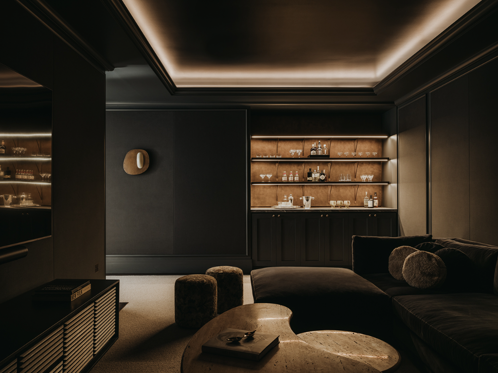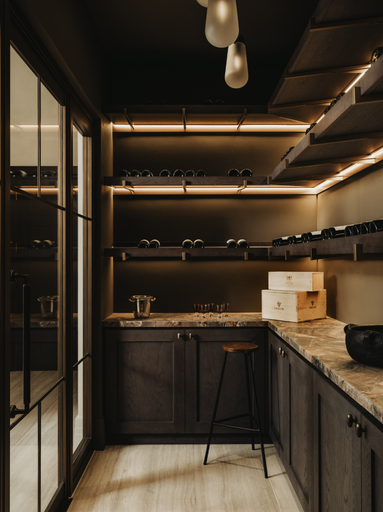 與廚房相對的酒窖採用深色調設計,煙熏歐洲橡木飾面與石英岩檯面相結合,細節處點綴流暢的黃銅元素,配以紐約家具品牌Apparatus的蝕刻玻璃球形吊燈,營造出內斂雅緻的品酒環境。