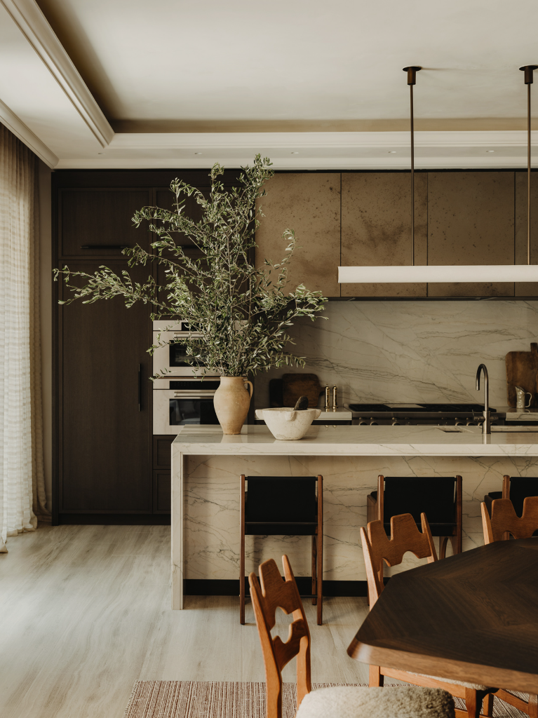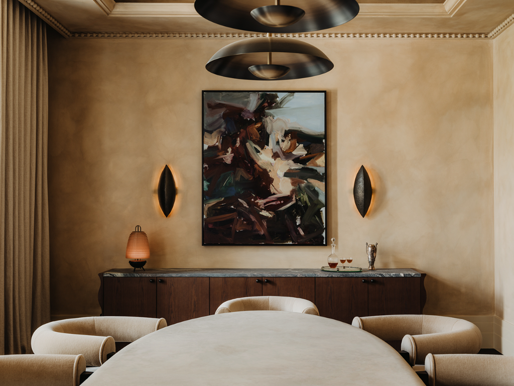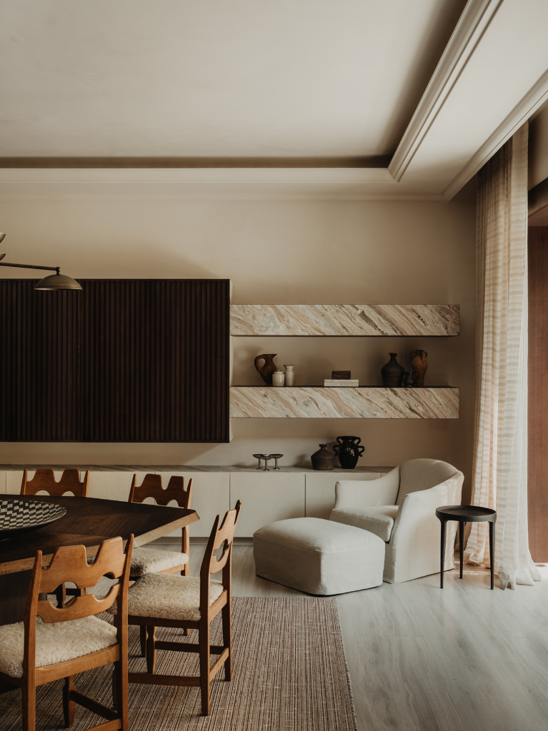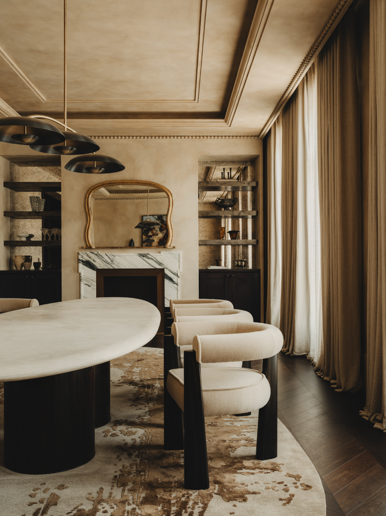 開放式廚房與餐廳能夠俯瞰私人花園,成為整棟住宅的核心區域。設計團隊巧妙融合古典與現代元素:訂製精緻橡木餐桌搭配丹麥設計師Henning Kjærnulf打造的「Razorblade」羊毛椅,視覺效果令人驚豔。電視巧妙隱藏在美洲胡桃木飾面櫃中,兩側配置懸浮式大理石展示架。中島上方懸掛法國設計工作室Garnier et Linker的白石膏吊燈,牆面藝術作品則出自藝術家Richard Zinon之手。