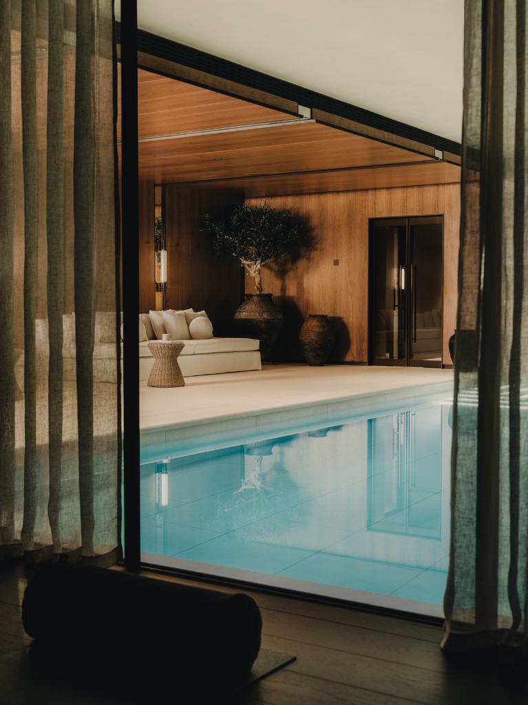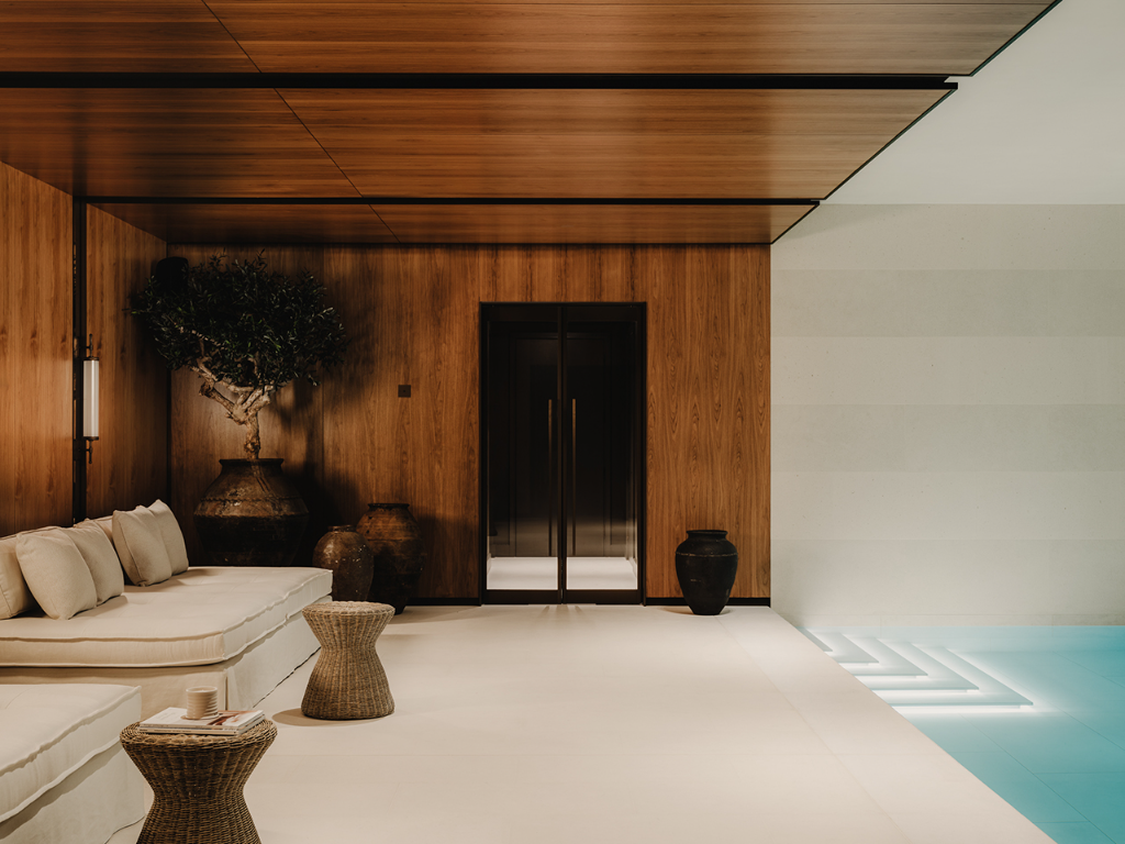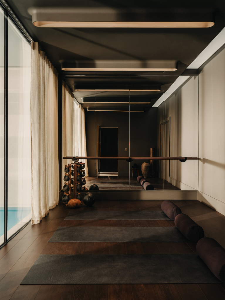 沿著樓梯深入較低樓層,映入眼簾的是靜謐私享的休閒設施。私人泳池成為寧靜放鬆的理想場所,健身房營造專注運動的熱血氛圍,三溫暖區則是運動後舒緩身心的完美延續。這些精心規劃的休閒設施,完美詮釋當代生活方式中達到身心健康的至高標準。