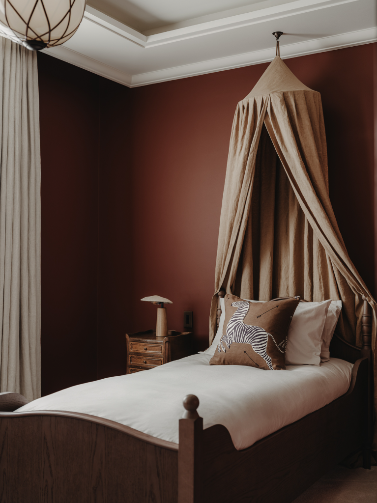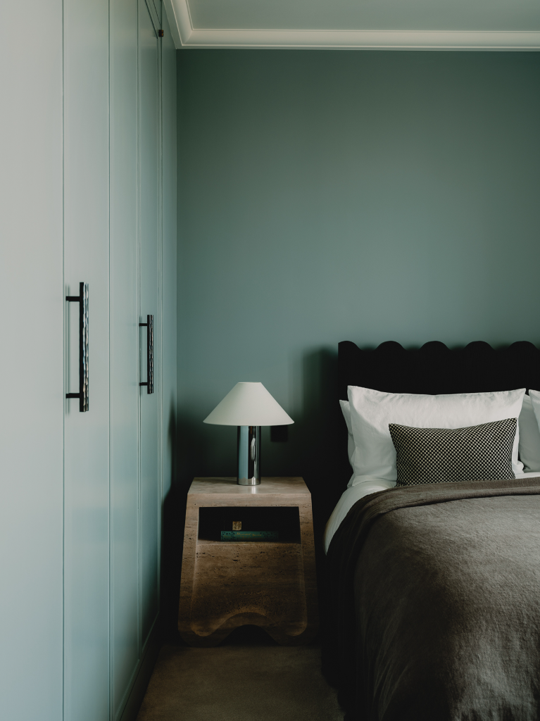 其餘臥室展現各具特色的色彩美學,柔霧藍色牆面與精緻米黃色石材床頭櫃相映成趣,床頭點綴澳洲家品牌Mcmullin & Co的現代感鍍鉻檯燈;而帶有泥土氣息的紅褐色牆面則營造出浪漫溫馨的愜意品味。