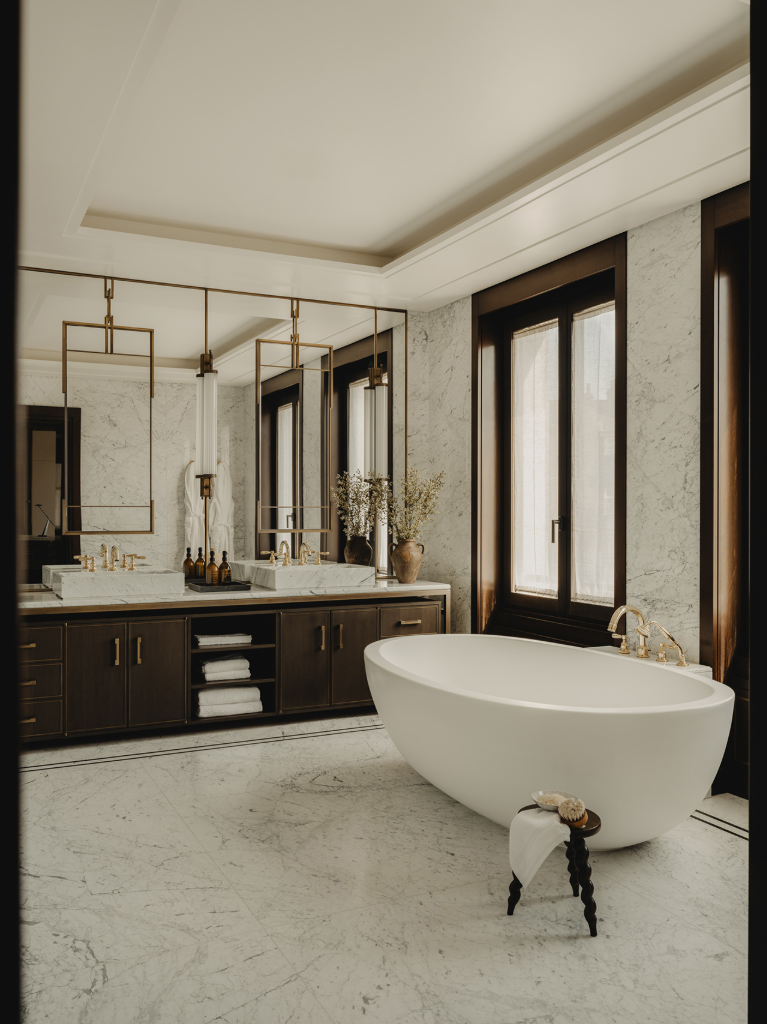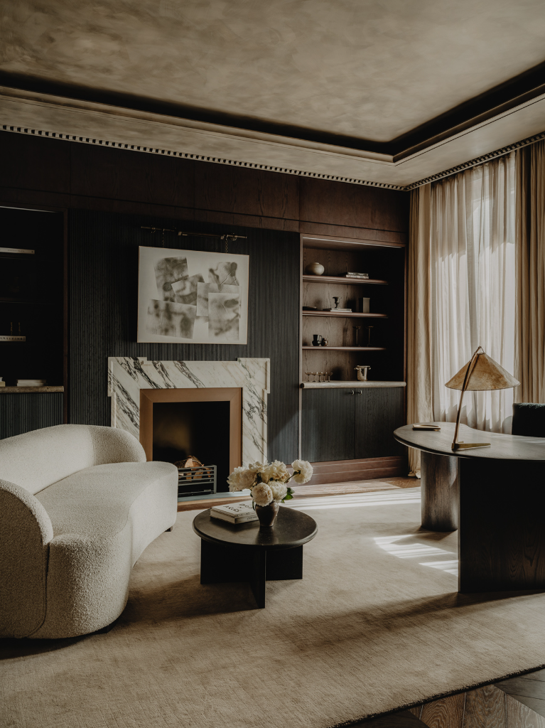 書房則呈現截然不同的氣質,深色調營造出沉穩硬朗的觀感。深棕色洞石木作與煙燻歐洲橡木飾面相得益彰,中央擺放英國家具設計師Fred Rigby打造的烏木辦公桌及訂製黑色熔岩石圓桌,再輔以由奧地利燈具設計師Julius Theodor Kalmar於1950年代設計的稀有黃銅檯燈,以及選自1st Dibs的琺瑯玻璃古董壁燈,為整個房間點亮雅緻光芒。