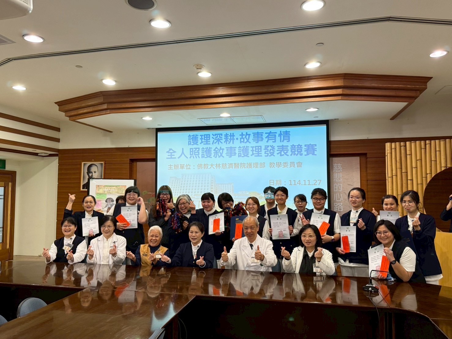 活動在一片熱烈掌聲中結束,並頒發了海報與口頭發表的獎項,讚揚了團隊們運用愛心和專業技能陪伴病患與家屬的傑出成果。獲得第一名的斗六血液透析室團隊深入理解病人的恐懼、期待與家庭壓力,設計更貼近其生命經驗的照護方案,不僅照護病人到最後,更陪伴家屬走過哀傷,用照護不只停在病人身上,還延伸到家人,故事充滿溫暖。大林慈濟醫院表示,未來將持續推動敘事護理,期盼醫療團隊在專業之外,更以同理與關懷提升照護品質,為病人與家屬帶來力量與希望,同時讓護理人員彼此交流學習,在臨床工作中不斷傳遞有溫度的照護,實踐全人照護的真諦。