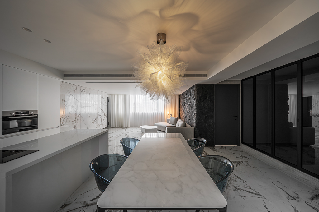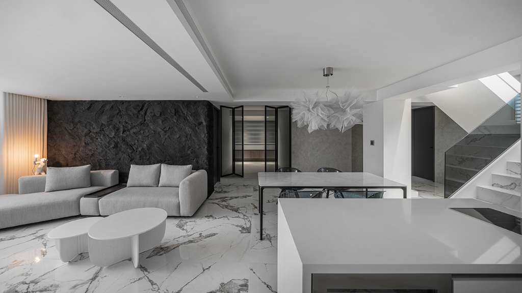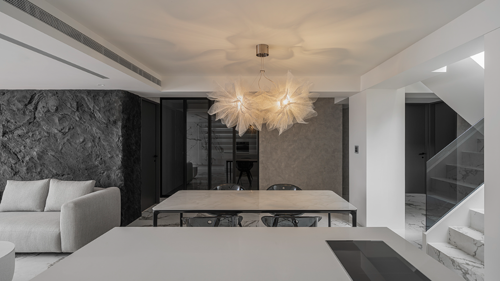 色彩方面,設計師選擇黑、白、灰作為主基調,克制卻極具個性。白色石紋磁磚從入口處延伸至客廳與餐廚,令空間尺度被悄然拉伸。沙發背牆大膽選用黑色雕塑水泥,由師傅手工鏝抹完成,加上設計師精準修正線條,凹凸肌理在光影交錯間低語,如同靜默的藝術牆,成為住家中最具張力的存在。電視牆選用與地坪同紋理的白色大板磚,並刻意於下方留白退縮,創造豐富層次感,避免顯得過於單調。黑白灰三色之間,形成了詩意般的互動,既對立,又和諧。