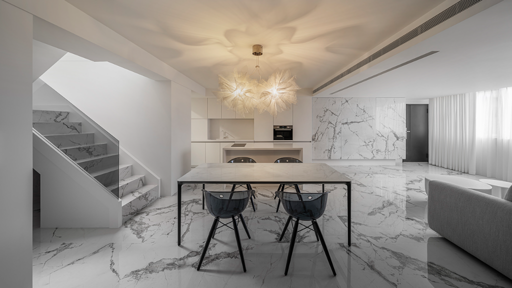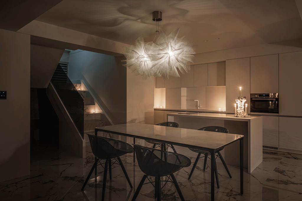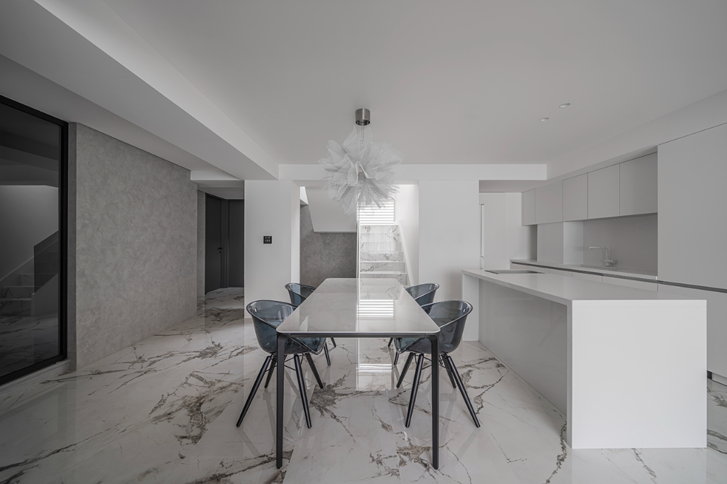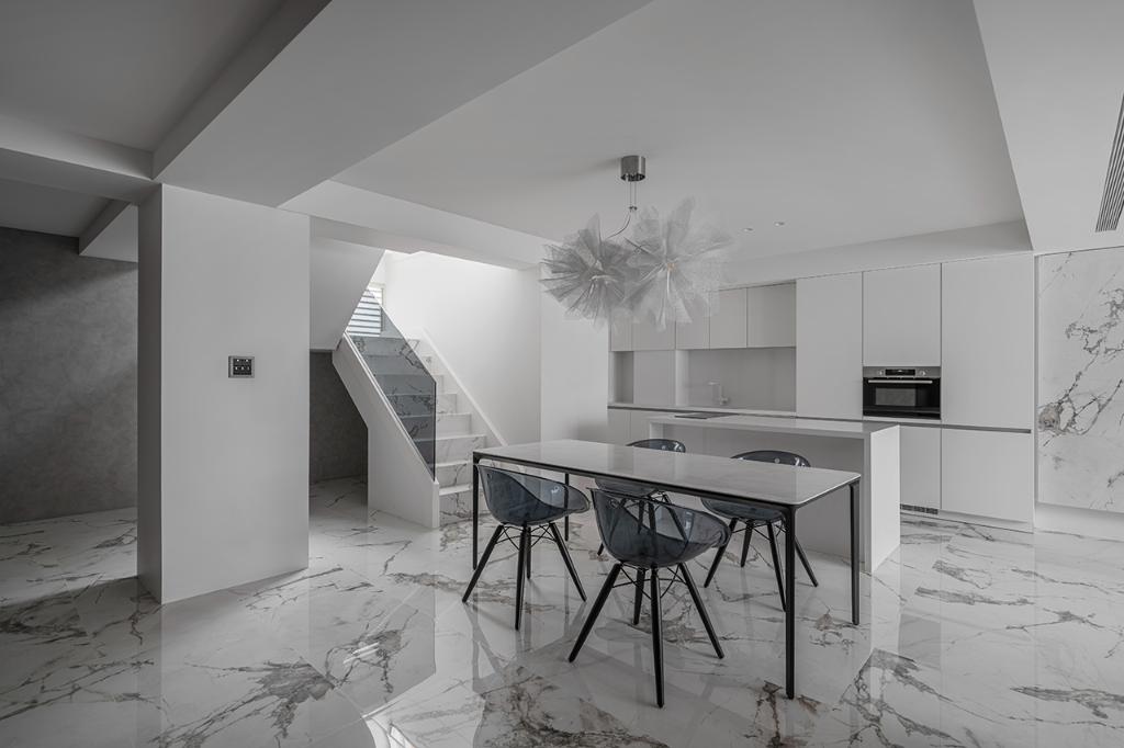 餐廳則藉透過輕盈筆觸描繪。深灰金屬桌腳與透明壓克力餐椅構築輕盈視覺結構,搭配上方宛如浮雲飄逸的網狀吊燈,燈光投射後於天花映出一圈圈花朵狀倒影,為此處增添一抹詩意氣息,引導屋主放慢腳步,享受日常片刻的柔光。廚房則劃分為雙區,外側中島由白色人造石鋪陳,結合同樣純白色系的西式廚房,盡顯乾淨俐落之美;內側則為獨立的中式廚房,能妥善隔絕油煙。兩種不同場景,對應不同烹飪習慣,更符合現代家庭的使用邏輯。一旁樓梯下方的小角落也未被忽略。考量到屋主飼養毛小孩,故特別於此另闢寵物專屬空間,設有休息與如廁區域,充分展現對家中每一份子細膩入微的關懷。