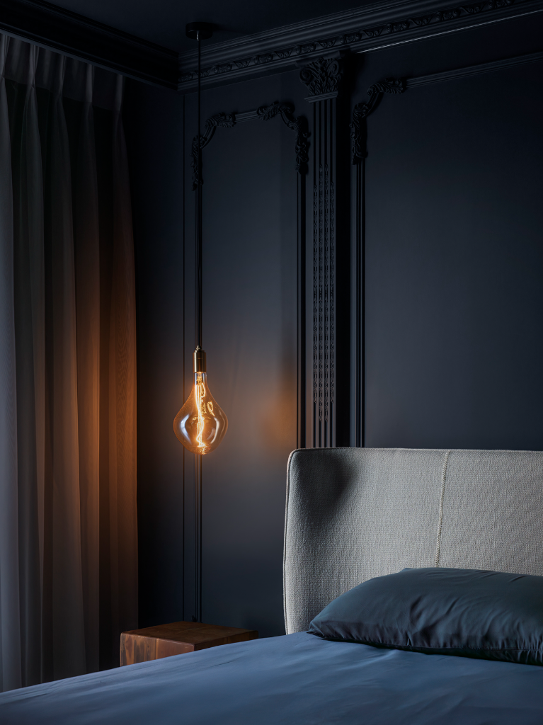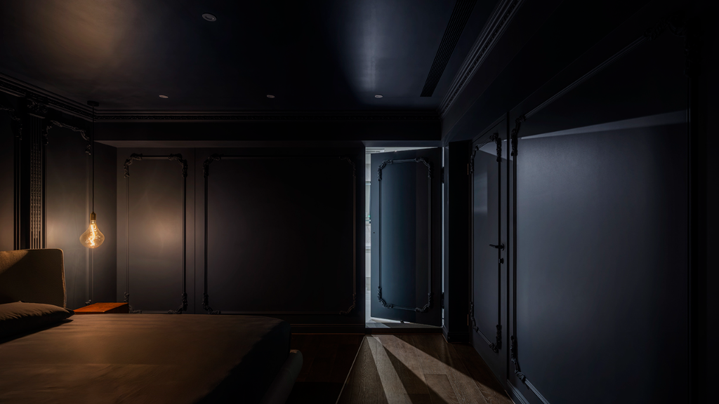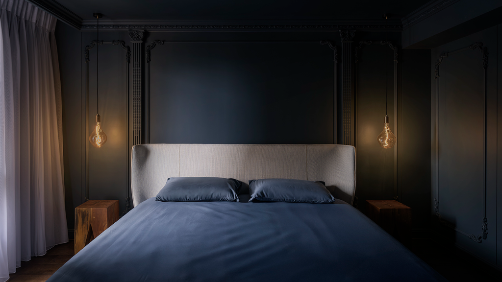 拾階而上,氛圍悄然轉換。主臥室有別樓下的明亮純白,改以藍灰色調噴漆處理牆面與天花,再搭配雕花線板與木地板,勾勒沉靜而帶有古典氣質的質感。床頭兩側垂掛手工玻璃吊燈,在昏黃燈影裡折射出微微漣漪,為房間增添幾分神秘與浪漫氣息。