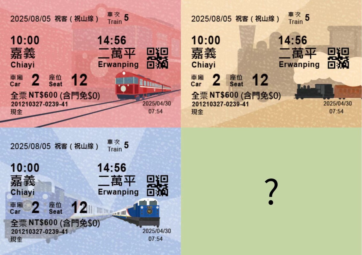 從12月1日起至林鐵及文資處各車站購票(神木站及祝山站除外),搭乘阿里山小火車,即可收藏全新設計「節慶限定款車票」,新車票結合林鐵歷代特色火車,4款票面各為Shay蒸汽火車、中興號、栩悅號及隱藏款,邀請民眾搭乘阿里山小火車收藏4款車票試手氣,幸運的旅客將可獲得限量版隱藏款車票。