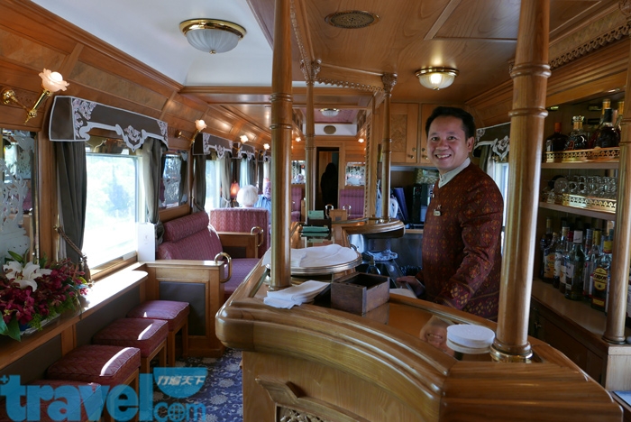列車上還有一節Saloon Car,這兒宛若交誼廳 般,還有隨車專屬樂師彈奏動人的樂曲。由於車上 的歐美遊客居多,樂師一見到我們是東方面孔,以為是來自日本的遊客,立刻彈奏一首谷村新司的名曲「昂」(鳳飛飛翻唱,另一種鄉愁的原曲),後來跟樂師說,一行四人都來自台灣,樂師立刻笑了,比了一個OK的手勢,接著彈奏了「月亮代表 我的心」、「甜蜜蜜」以及「高山青」,還要求我們跟著唱,一時之間,氣氛熱烈了起來,人與人間的距離拉近不少,鄰座來自泰國的大姐貴婦跟我 說,她好喜歡鄧麗君的歌,還能用中文哼上幾句。