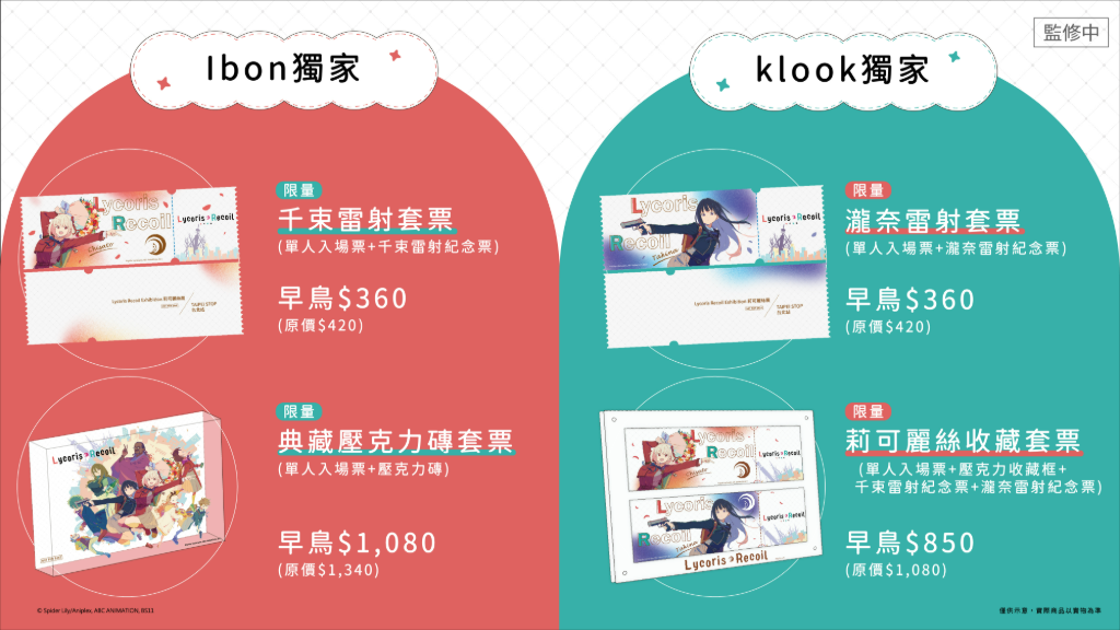 所有購票入場粉絲皆可獲得 「角色立牌(共 9 款隨機)」一個,不僅能以早鳥優惠價格入場,更能搶先收藏專屬特典。此次預售單人票為 NT$280,另推出多款特典套票,包含 ibon 獨家的「千束雷射套票」與「典藏壓克力磚套票」;Klook 獨家的「瀧奈雷射套票」與「莉可麗絲收藏套票」,各套票皆搭配限定特典,絕對是粉絲不可錯過的收藏選擇。