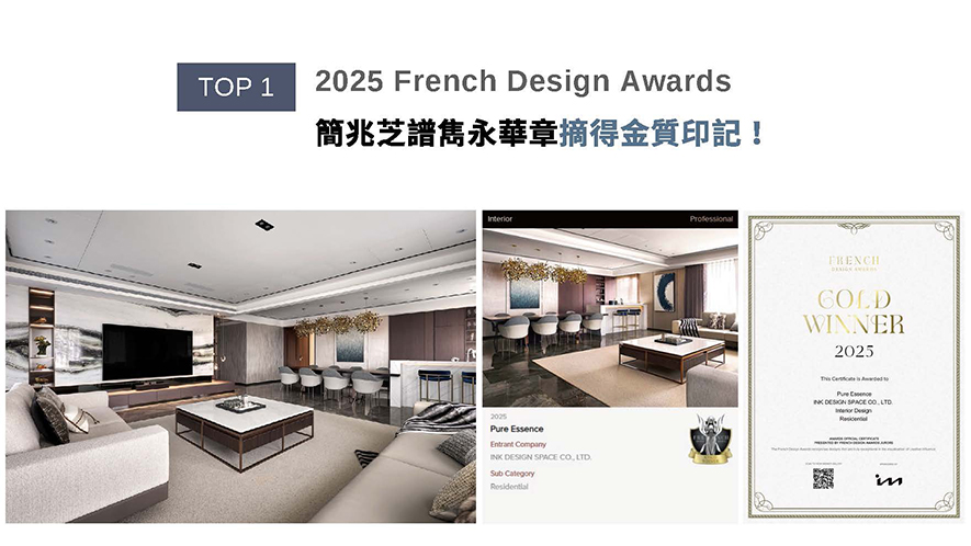 French Design Awards透過表彰融匯創造力和美學功能、可持續性的雋永作品,鼓勵所有創作者為設計領域注入嶄新生命。簡兆芝設計作品以灰色基調輔搭木質元素,靈動金屬亮片點綴簡約俐落的線條肌理,折射迷人動態光感,若星光在沉穩氛圍中閃耀,勾勒純粹雅致的現代富麗居所《璞玉天成》,於本屆賽事獨放異彩,勇奪「金獎」!
