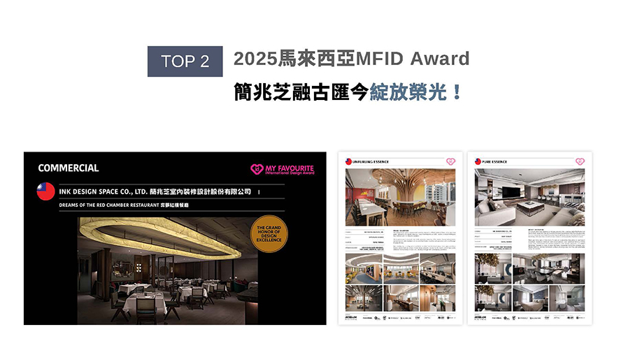 MFID作為馬來西亞首個且唯一的國際設計獎項,在「創新、永續發展與文化交融」的指引下,開啟設計產業的無限可能。簡兆芝設計師為《弈夢紅樓餐廳》佈置繁華而不失雅致的用餐空間;《衍流萃息》則釀出清新和諧、靈活的現代商辦氛圍,兩件成功摘下本屆賽事「Winner」榮耀!而靜謐舒適的都會桃源《璞玉天成》,亦挺進入圍席次!