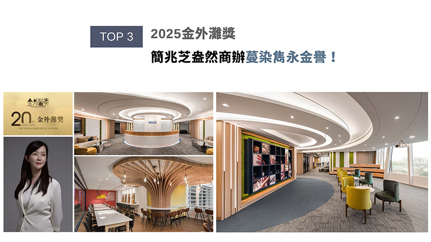 「金外灘」獎迄今已有20年歷史,不僅是華人室內設計領域的經典獎項,也是華人室內設計行業發展的風向標。簡兆芝團隊透過可切換通透及霧面兩種模式的電控玻璃,規劃能充分引入採光、亦可兼顧會議時隱私的明朗辦公室,而戶外自然綠意及大廳裝飾的永生苔蘚相呼應,勾勒企業永續繁榮意象的商辦作品《衍流萃息》,獲頒「最佳辦公空間獎」金獎的殊異佳績!