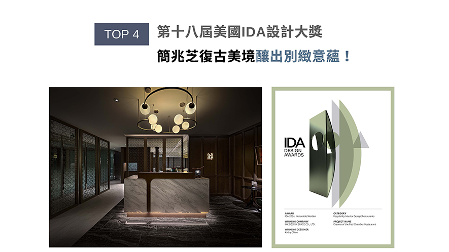 美國IDA國際設計大獎以創新性、實用性和發展性等多種面向為評選標準,發掘各領域的新興人才。簡兆芝室內設計匠心活用飯店各層不同的風情轉換,全案鋪展深木復古感,令來客由淺色調一樓大廳乘坐電梯入店時,透過截然不同的沉穩雅韻予以人們深刻迎賓印象,唯美亮眼的《弈夢紅樓餐廳》勇奪「Honorable Mention」!