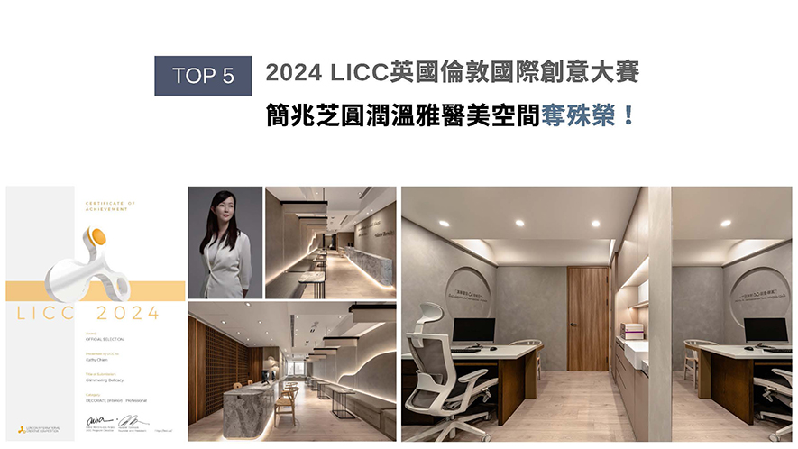 全球指標性設計大獎London International Creative Competition,於2006年開展至今,每年皆引領建築、繪畫、影像等11大創作領域齊步向前。簡兆芝設計團隊取女性優柔的身形曲線意象,搭配布料和鍍鈦鐵件等人造元素的細節點綴,齊譜以人工呈現自然美的企業理念,醫美空間《柔曦映弧》奪得賽事「Official Selection」獎項!