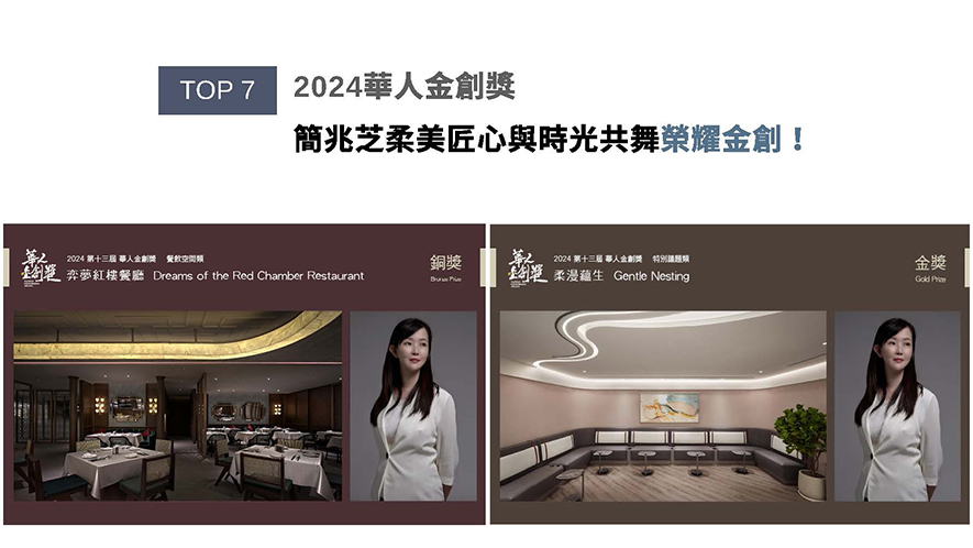 以「和諧、融合」理念巧妙演繹迥異場域的簡設計師,在醫療場域《柔漫蘊生》中彰顯醫療團隊呵護新生的使命感;而老上海風《弈夢紅樓餐廳》則使顧客在華麗復古氛圍中品味人生的圓融。兩件作品分別奪得2024華人金創獎「特別議題類」金獎與「餐飲空間類」銅獎榮譽!