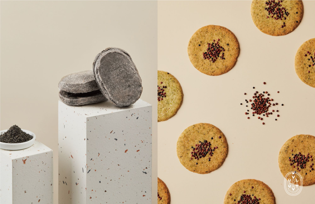 因甜點主廚Vicky從小看著爺爺耕作的背影,深知小農耕作的艱辛,攜手各地小農,期盼透過品牌的力量,讓更多人深度認識並喜愛台灣食材。逾十種超人氣法式甜點皆融合小農在地食材。「荔枝烏龍茶酥餅」使用南投的荔枝烏龍茶葉,一入口清甜果香與茶香細膩浮現,優雅精緻於舌尖綻放,「芝麻奇亞籽達克瓦茲」則是嚴選台南有機芝麻粉,醇厚香氣撲鼻,舌尖尾韻綿延不散;「紅藜海苔胡椒脆餅」保留有機栽植的紅藜麥穀物的脆粒口感,海苔的鹹香與胡椒恰到好處的些微點綴,豐富了法式薄餅的細膩鹹香 。
