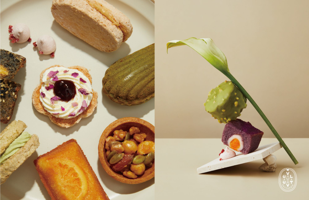 「櫻花蝦紫米香鹹餅乾」採用屏東東港特有櫻花蝦,及濁水溪無毒栽種的甜脆香紫米,鮮味香氣濃郁,居鹹味餅乾人氣之冠!「茶梅焙茶旅人蛋糕」南投飽滿茶梅藏於其內,與綿香柔潤巧克力蛋糕在味蕾舌尖巧妙維持酸甜平衡。每道甜點不僅有著藝術品般的視覺設計,一場味蕾浪漫邂逅,更可感受到對於土地的熱愛與層次溫度。