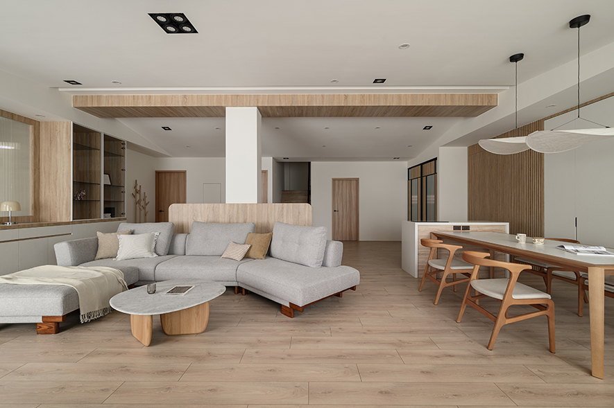 入門之際,清光柔潤地引領步伐,穿越絲滑圓角構築的玄關,日光自長虹玻璃輕盈灑落,牽引視線流轉於木質與白灰交織的暖域。空間如詩緩展,無繁複裝飾,僅以細膩材質與純粹比例,蘊藏著極簡日式的深沉涵養。