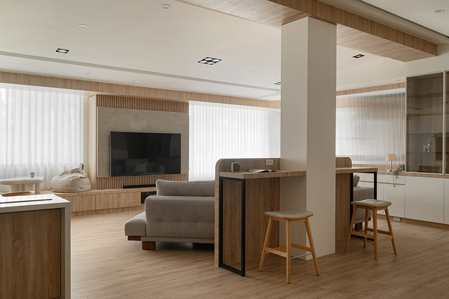 踏入門扉,曲面木作隔屏如月牙般優雅延展,巧妙勾勒出內外之界。窗櫺引入的日光灑落墨玉般的石紋地坪上,形成光律交織的迎賓序曲。弧形木作包樑與玄關櫃採用相同淺木質調,從立面延伸至頂塑造連續包覆感,消解原有建築結構的剛硬轉角,猶如安穩的臂彎,靜候歸人卸下風塵;在這初得安穩的懷抱中,旁側隔間牆轉角的弧形導引柔化空間的轉折,更進一步引領從外界喧囂至完全沉澱內心寧靜的步履,在這光線遞變的過渡之境,心緒隨著曲線的韻律,緩緩沉澱,回歸家的懷抱。