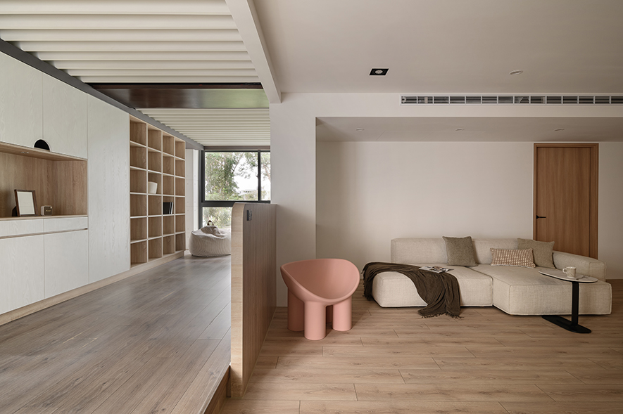 二樓的私密天地保留舊時的格柵天花與架高木地板,當陽光透過落地窗灑入,與其交織成錯落有致的視覺層次;柔軟的懶骨頭沙發慵懶地倚在窗邊,邀請主人在此沉浸於書海,後方的開放式收納層架井然有序,既是知識的寶庫,也是生活記憶的展示舞台。