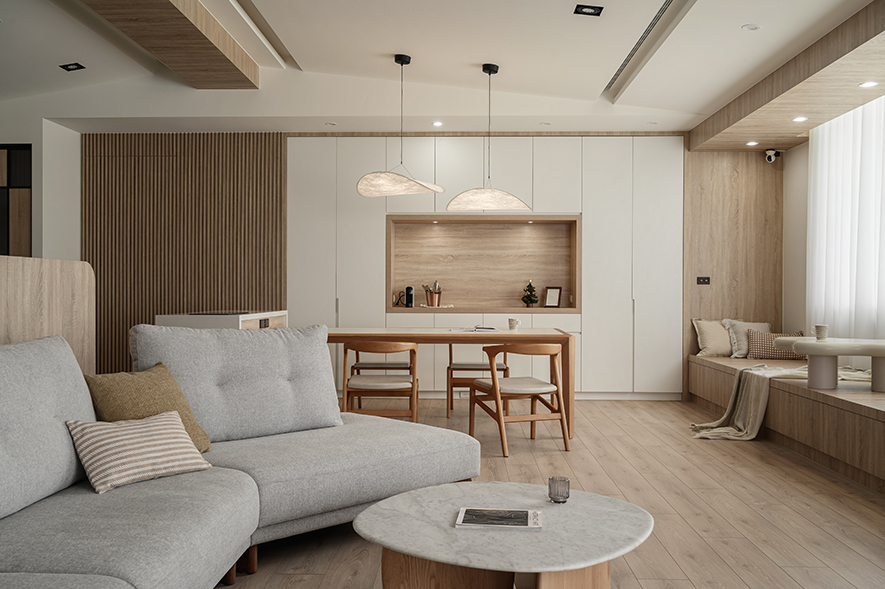客廳灰色織物沙發低調沉穩,搭配圓形桌面的木質底座茶几,營造質樸而不失雅緻的會客場所;沙發半高背牆巧妙融入工作桌功能,既是空間的分界,亦為居者於開放格局中尋得專注一隅。對向大片落地窗將戶外綠意盡收眼底,陽光透過紗簾的過濾,化作柔和的光暈灑落;而窗邊長型臥榻以盈潤木調材質包覆,素雅軟墊相襯,恰似文人雅士的「觀景榻」,供人品茗觀雲、靜思冥想。整體細膩回應著生活的多重需求,在開闊無礙中保有各自的場域感,讓日常的每個片刻都能找到最適切的安放之處。