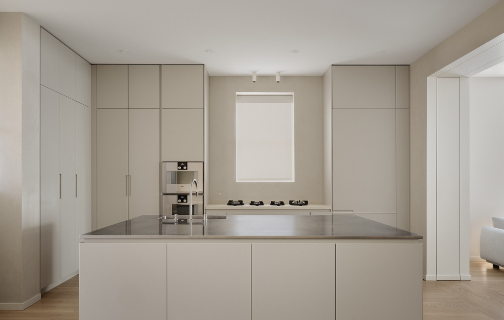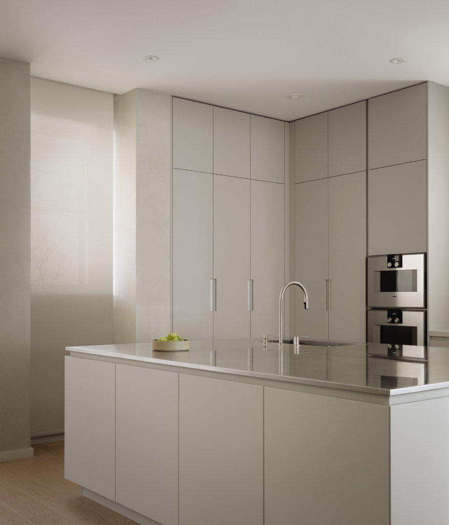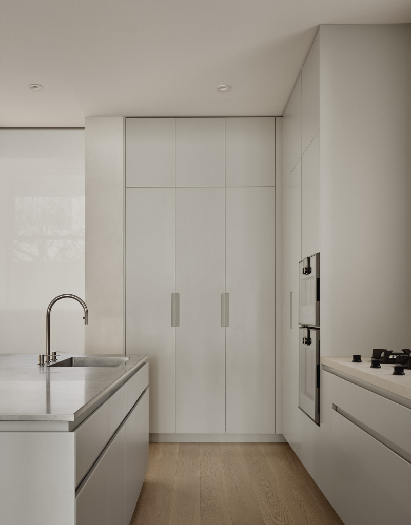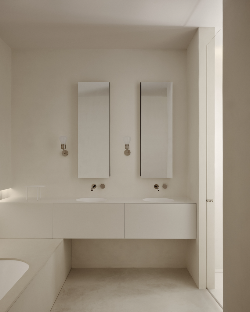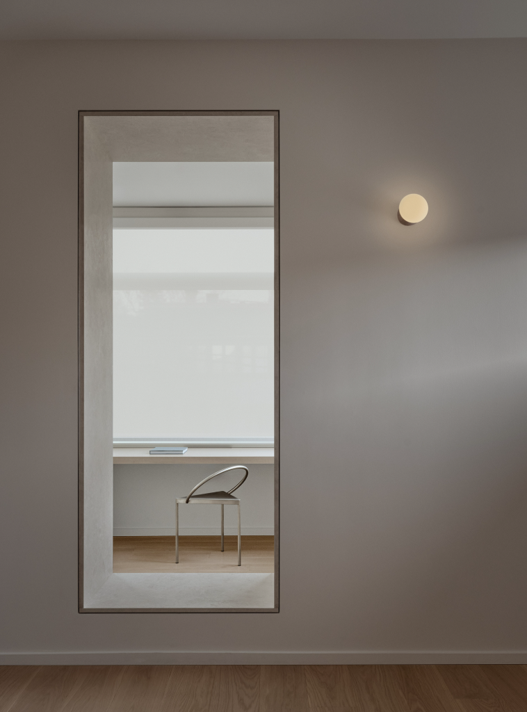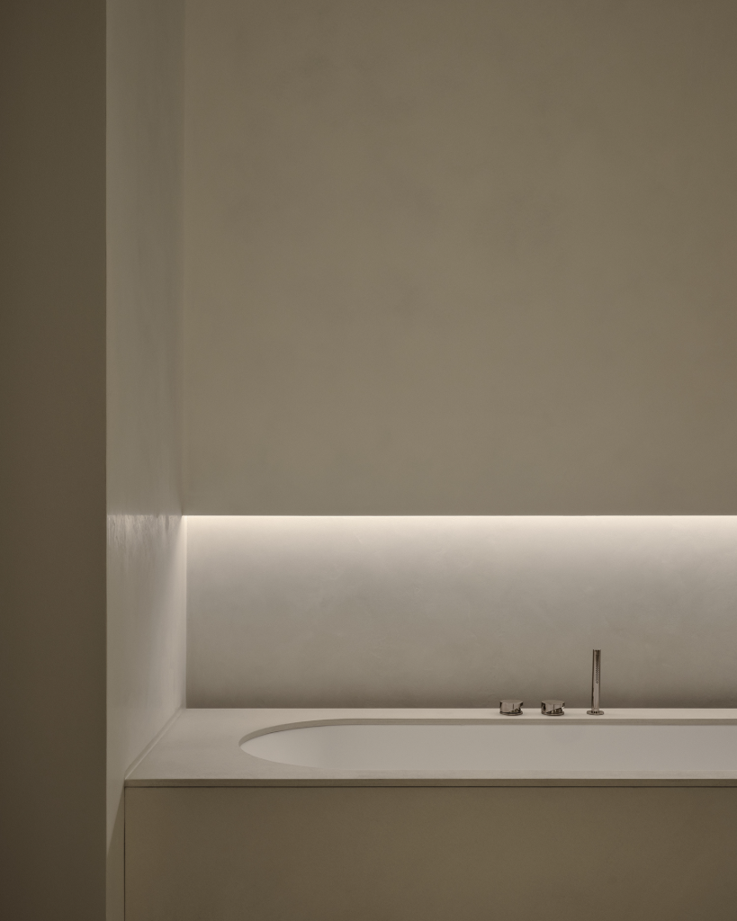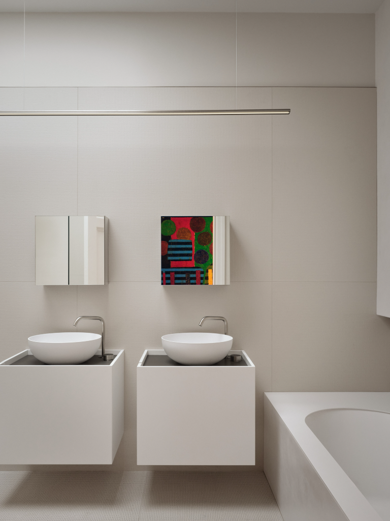 相較之下,孩子共用的浴室則多了幾分俏皮。方形洗手台、收納櫃與同樣形制的磁磚鋪陳於牆面與地坪上,透過尺度變化創造節奏感,展現出孩童專屬的活力。整體而言,設計師在材質方面貫徹了誠實與細膩的精神:廚房以胡桃木與灰泥牆面營造溫潤基調;衛浴空間則引入微水泥與浮雕瓷磚,讓肌理在光影間低語,打造出獨一無二的私密風景。