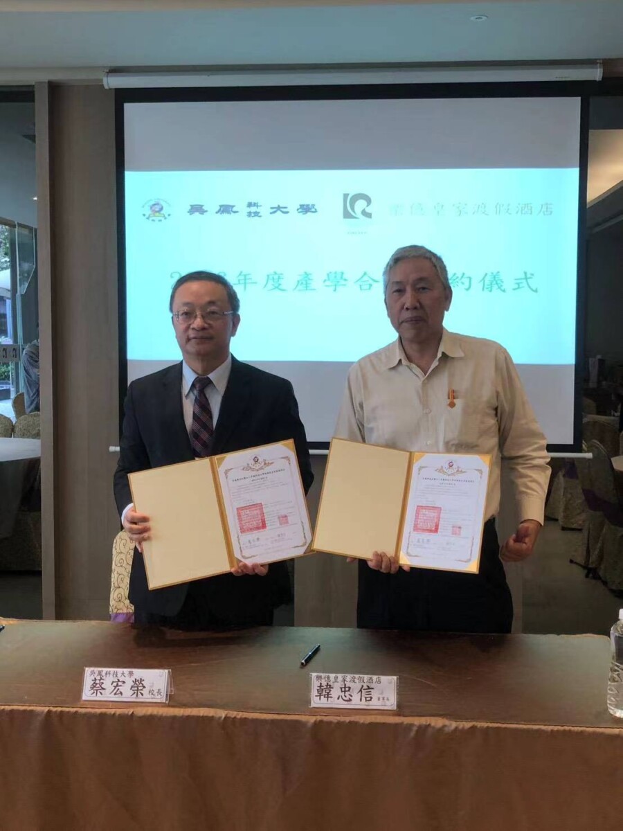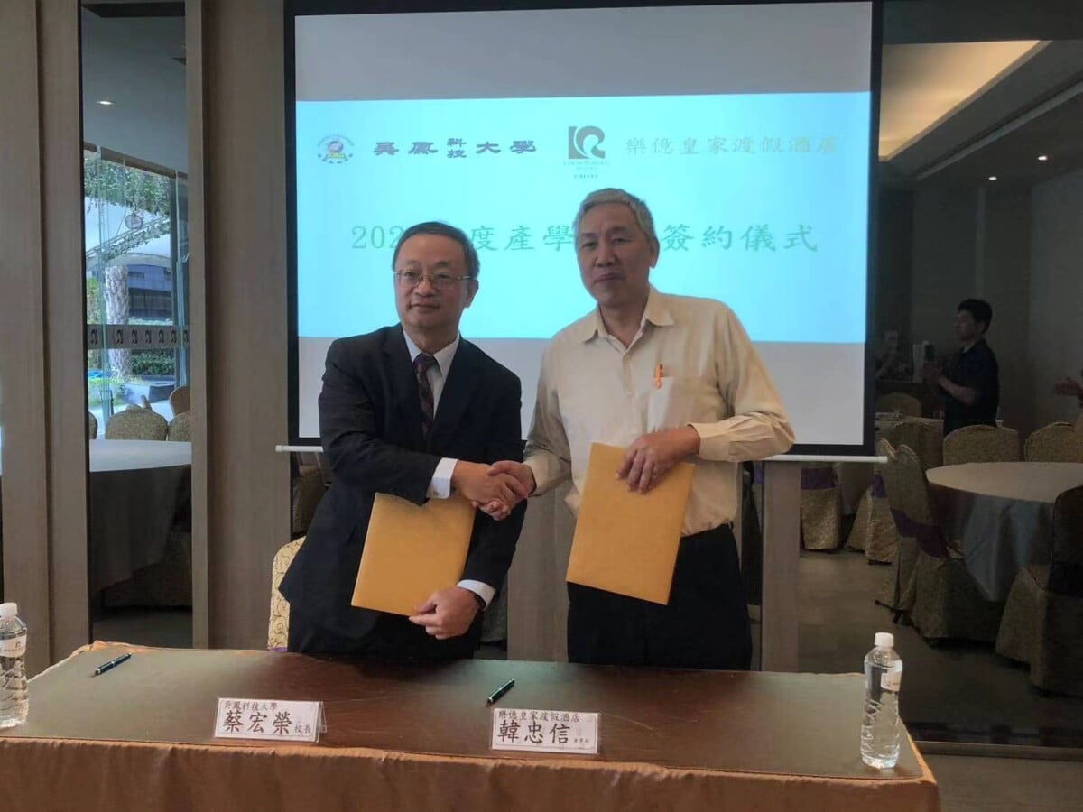 吳鳳科技大學為深化技職教育與產業接軌,12月3日於樂億皇家渡假酒店舉行產學合作簽約。簽約儀式由吳鳳科大蔡宏榮校長與樂億皇家渡假酒店韓忠信董事長代表簽約。校方主管以及樂億皇家渡假酒店管理團隊共同出席,場面隆重熱烈。雙方正式建立長期合作夥伴關係,期望以實務導向的教學模式,打造高品質產學合作平台,為觀光餐旅業培育具備專業技能與國際視野的優秀人才。